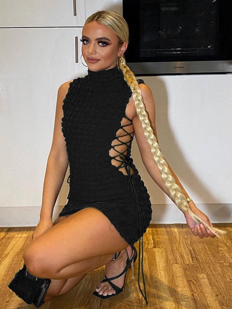 Dresses are perfect for any occasion. The mini dress is perfect for any event because it is so comfortable and elegant. This dress is made of chiffon and is hollow out. It has a turtleneck and is sleeveless.