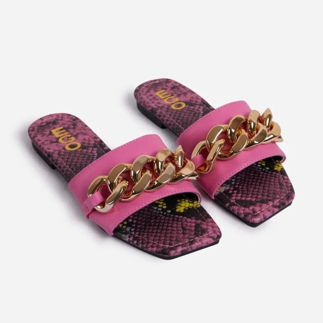 These sandals are made of PU leather and have a very delicate animal skin pattern. The front of the sandal has a chain decoration. It is available in various colors so you can match them with your favorite outfit.