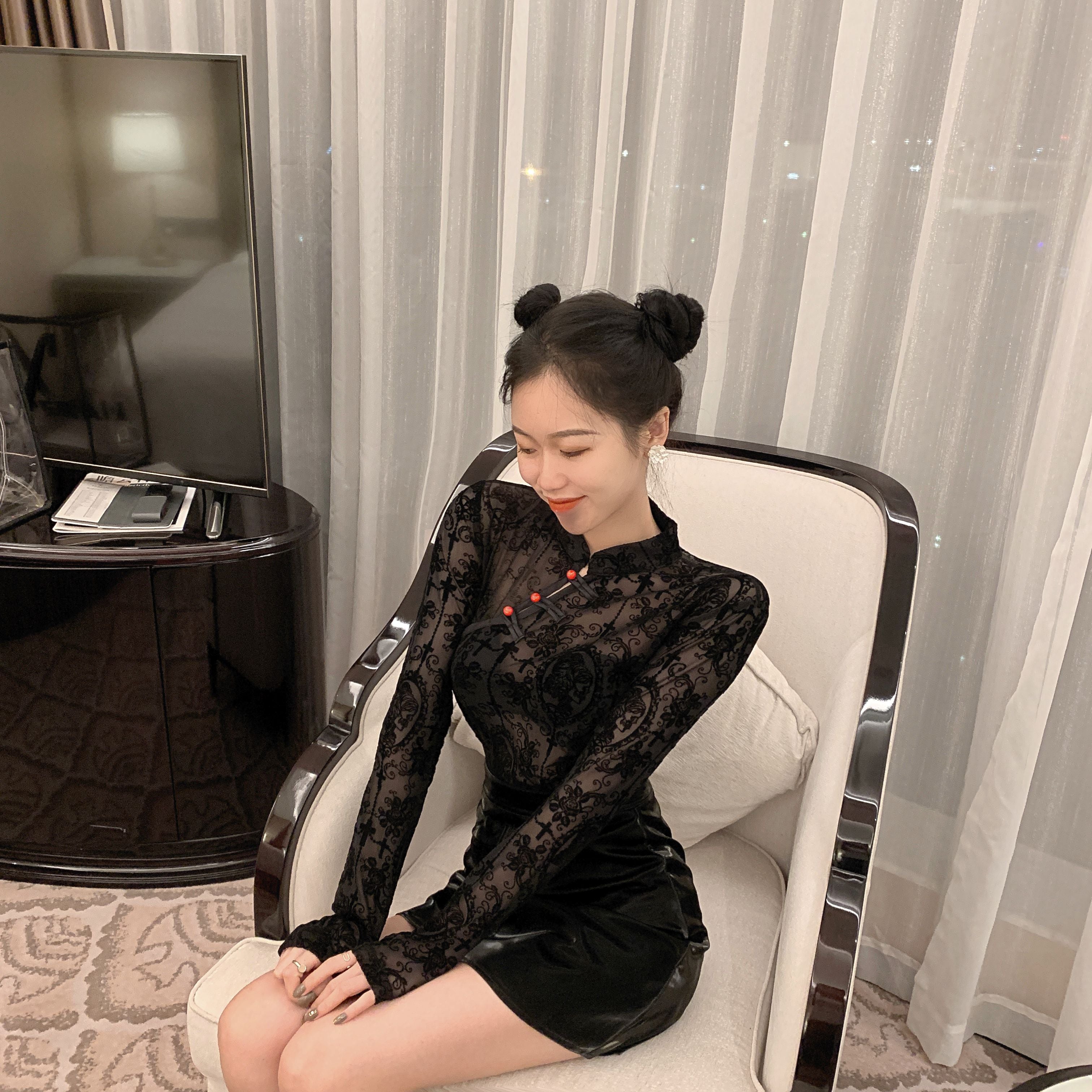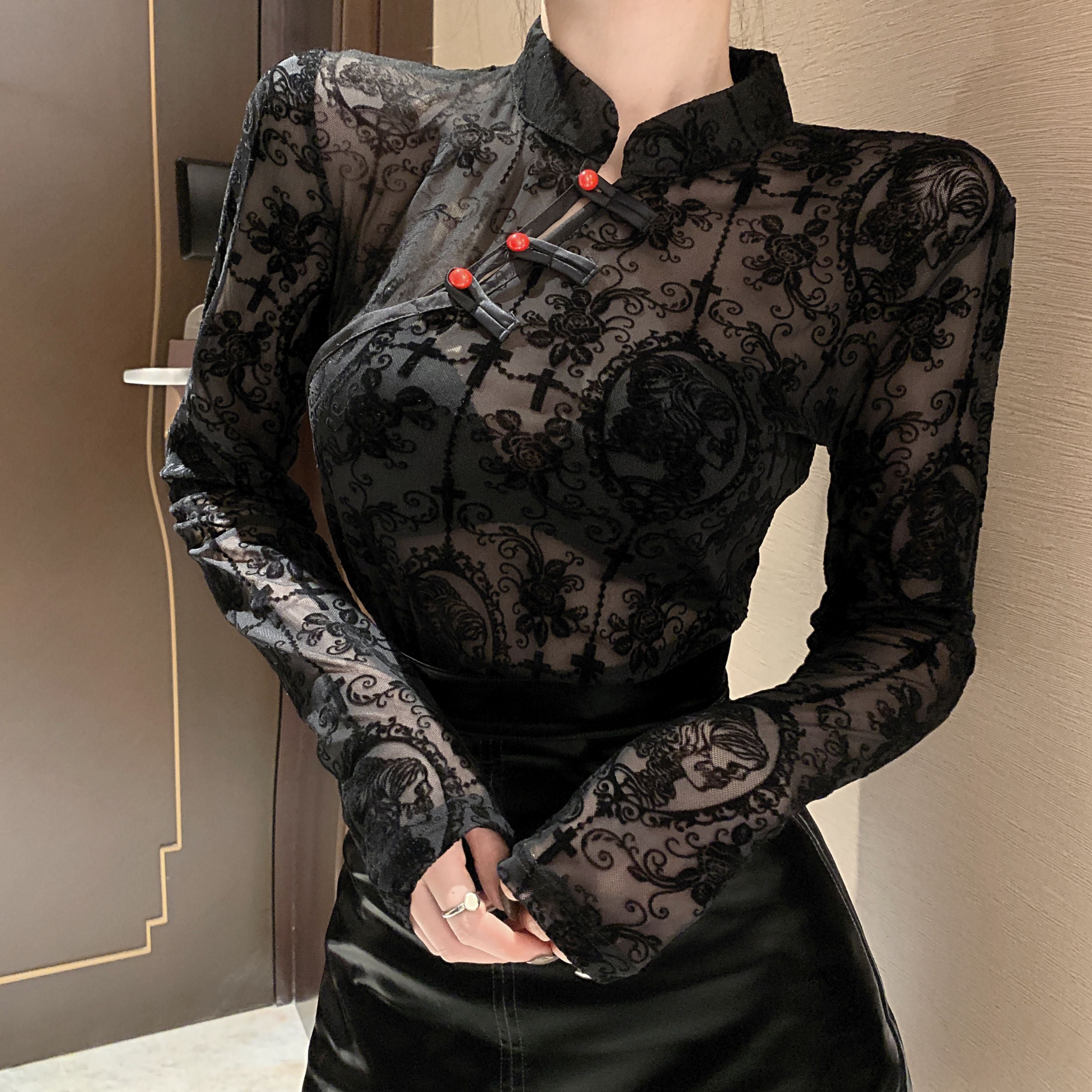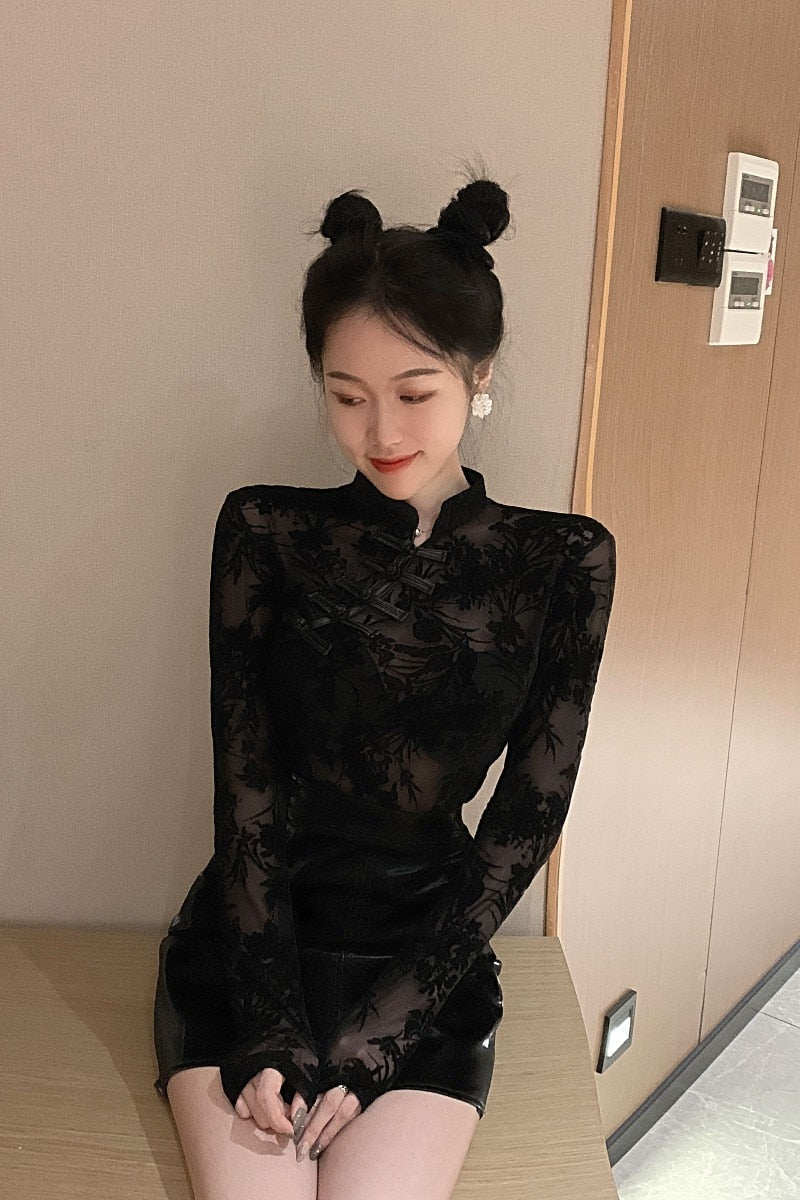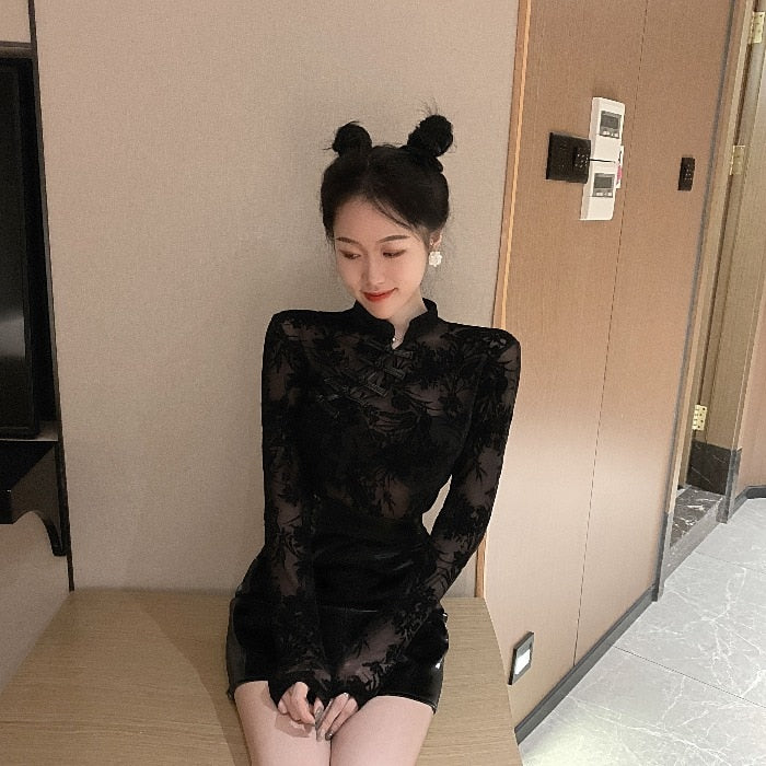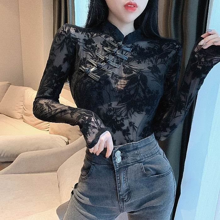 This long-sleeved blouse has a stylish gradient design that shows off both the front and the back. The see-through feature makes it a great choice to show off your best.