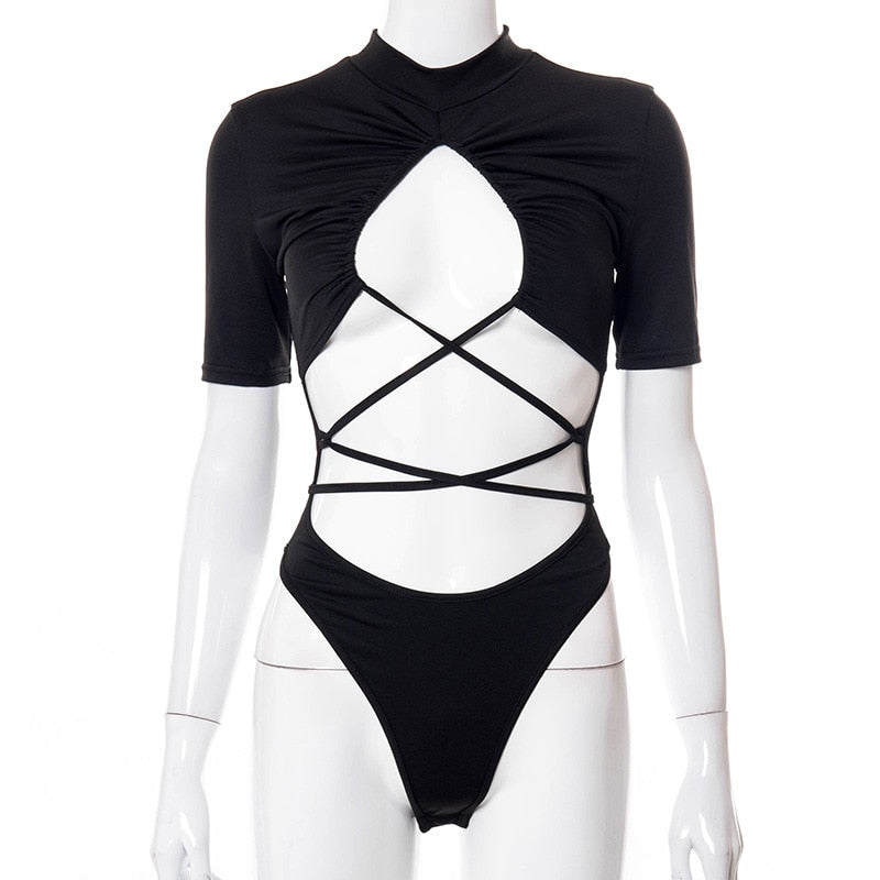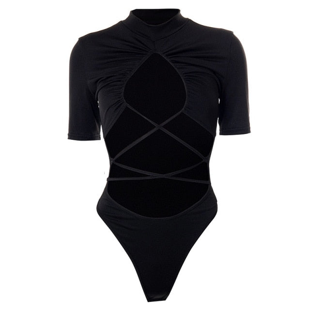 Short-Sleeved Hollow Out Bodysuit with Stand Collar and Polyester Spandex Material