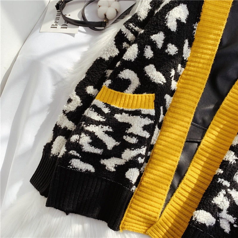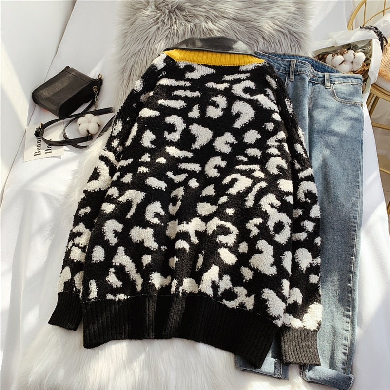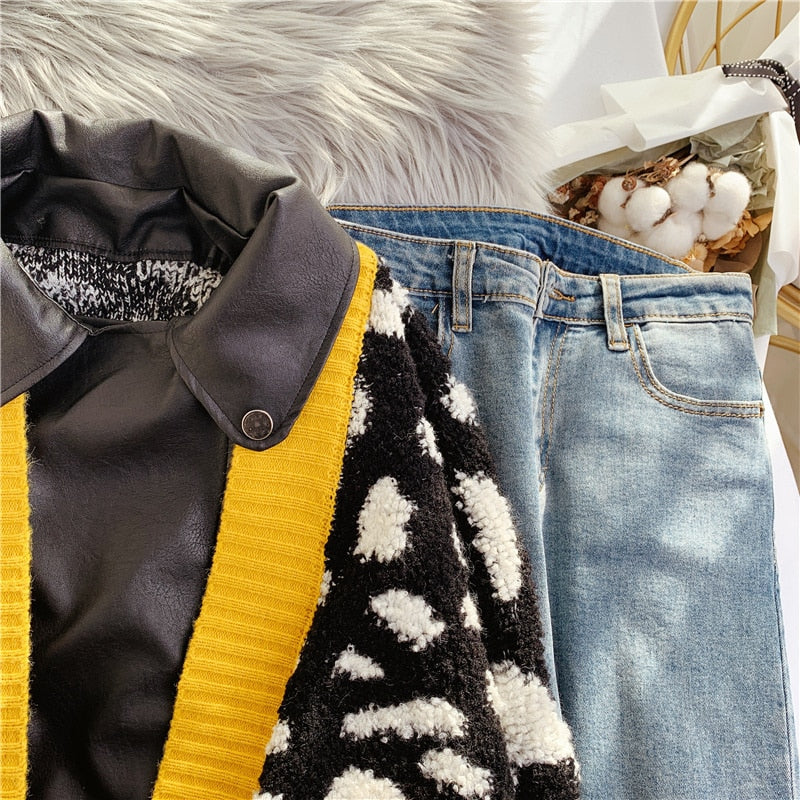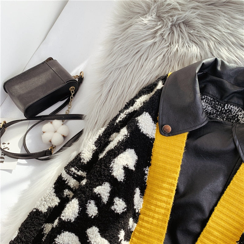 This sweater over leather patchwork style jacket gives a unique look. Featuring a zipper closure, the beautiful geometric pattern is also the perfect way to add some style to your outfit.