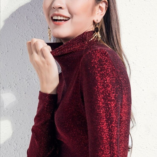 Polyester Spandex on Sparkling Turtleneck Women Shirts