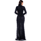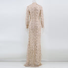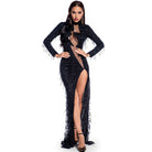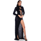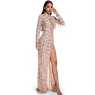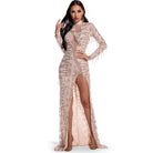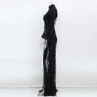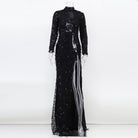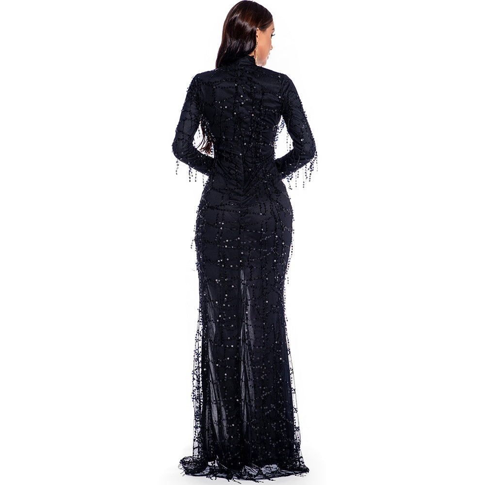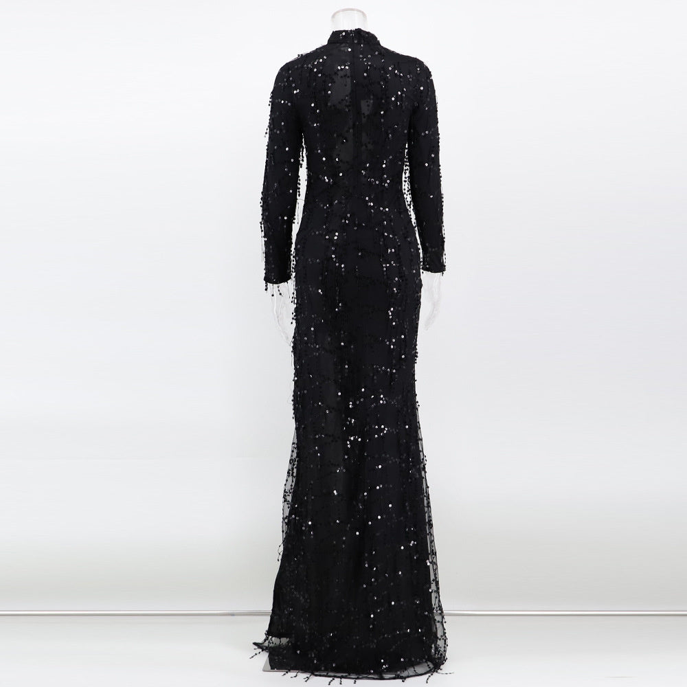 This sexy long dress is made of polyester and sequins, which is great for wearing to a party. The dress is see-through and features a slit up the front. The dress has long sleeves and a turtle neck.
