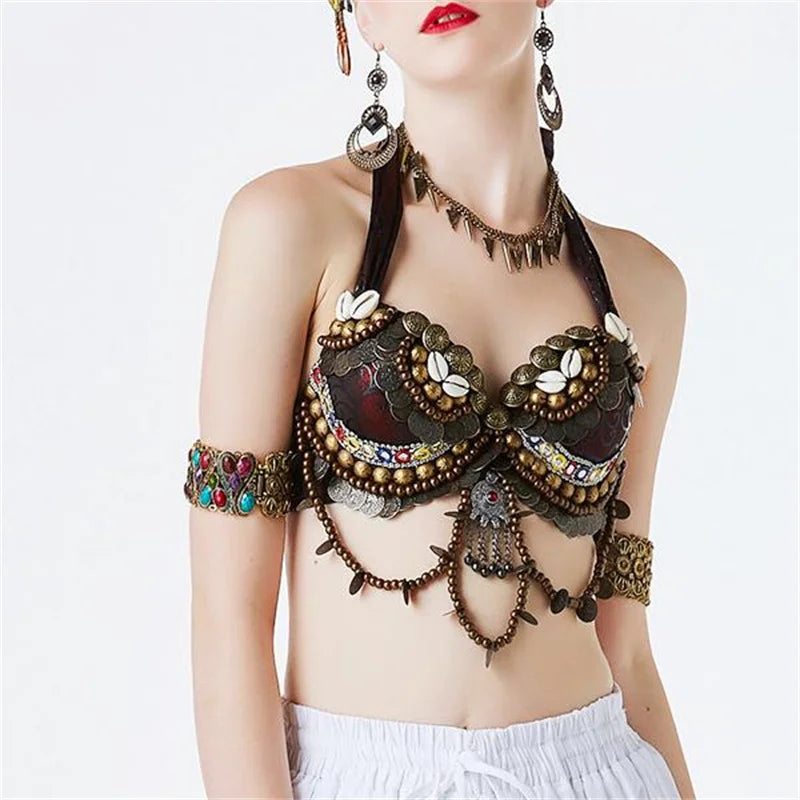 Elevate your style with Glorious Rise Body Jewelry! Made from comfortable and flexible spandex and cotton, this bra top is a must-have for any fashion-forward individual. With beautiful beaded and copper embellishments, it's the perfect statement piece for any occasion. Upgrade your look today!