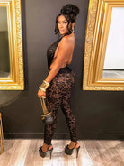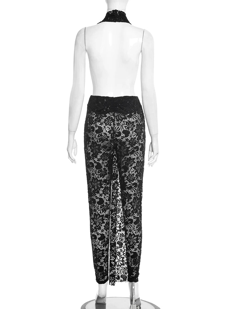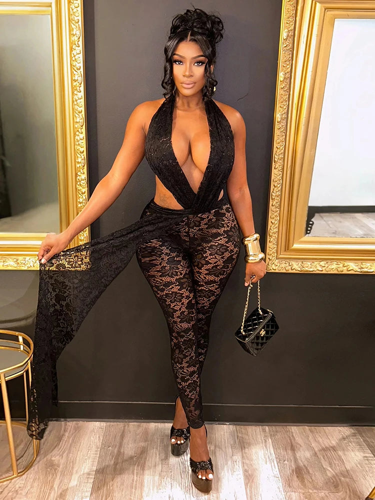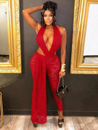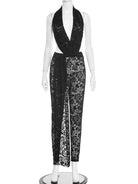 Unleash your boldest self in this daring backless V-neck lace jumpsuit. Crafted from a luxurious polyester and spandex blend, it hugs your curves with confidence while the plunging neckline and open back create an unforgettable silhouette. The delicate lace detailing adds an alluring touch of sophistication. Perfect for nights when you're ready to turn heads and make a statement. Stretch fabric ensures comfort without compromising that show-stopping look.