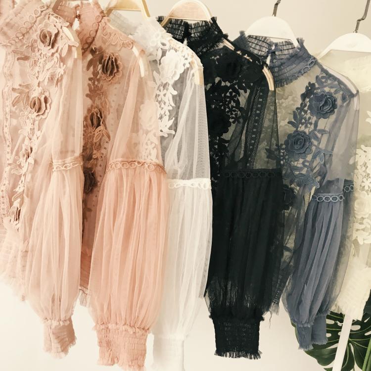 Long Lantern Sleeve See-Through Blouse with Flower Applique