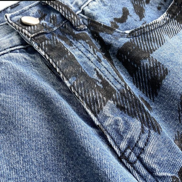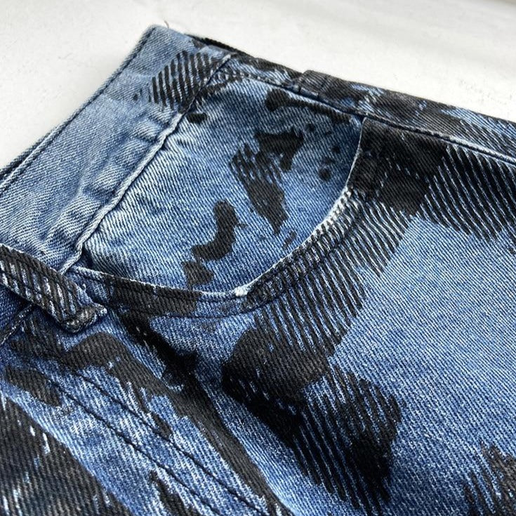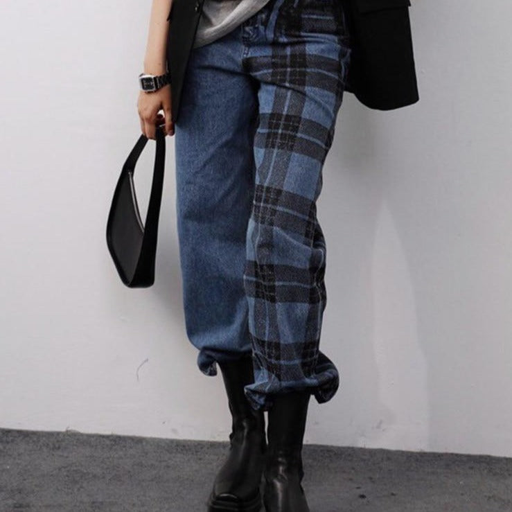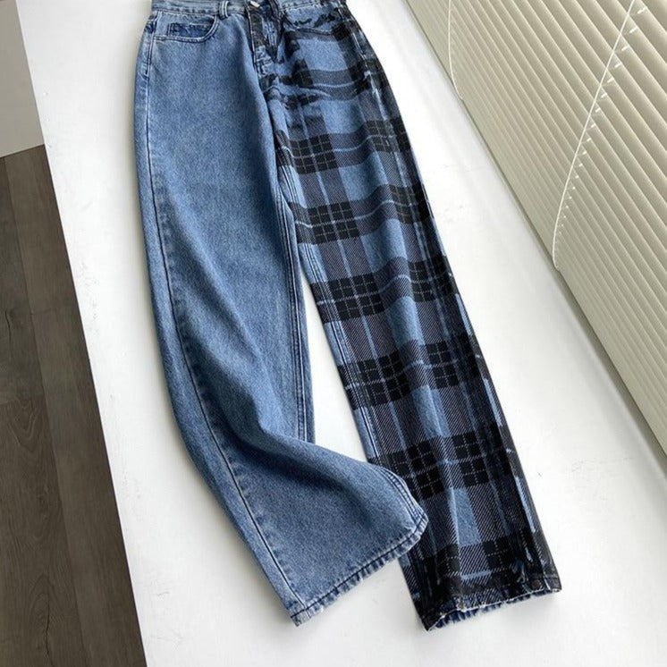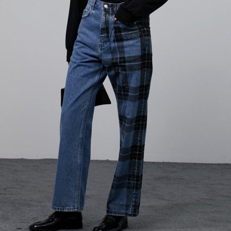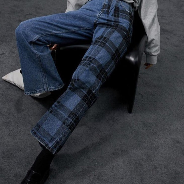 Solid and Plaid Patterned Straight Jeans with Polyester Woven Material