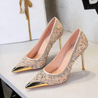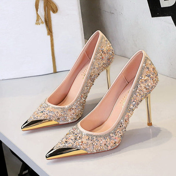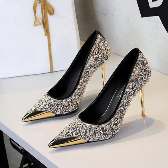 Glitter Affair Stiletto Heels dazzle with sparkling rhinestone patterns on a sleek PU upper. Featuring a sharp pointed toe, these heels offer a striking, fearless look that commands attention at every step.