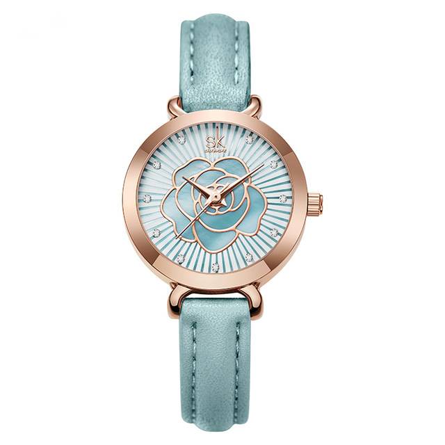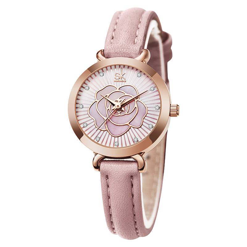 Rose Design Stainless Steel Round Watch with PU Leather Strap and Quartz Movement