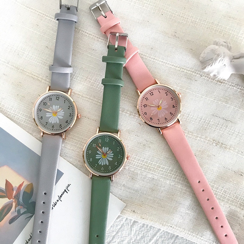 Lovely Daisy Design Stainless Steel Round Watch with PU Leather Strap and Quartz Movement