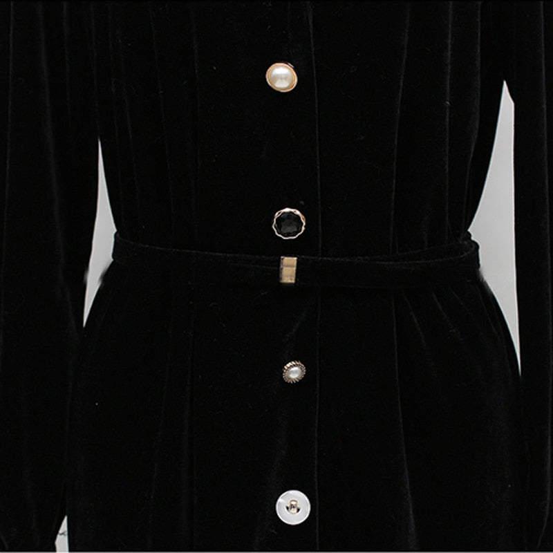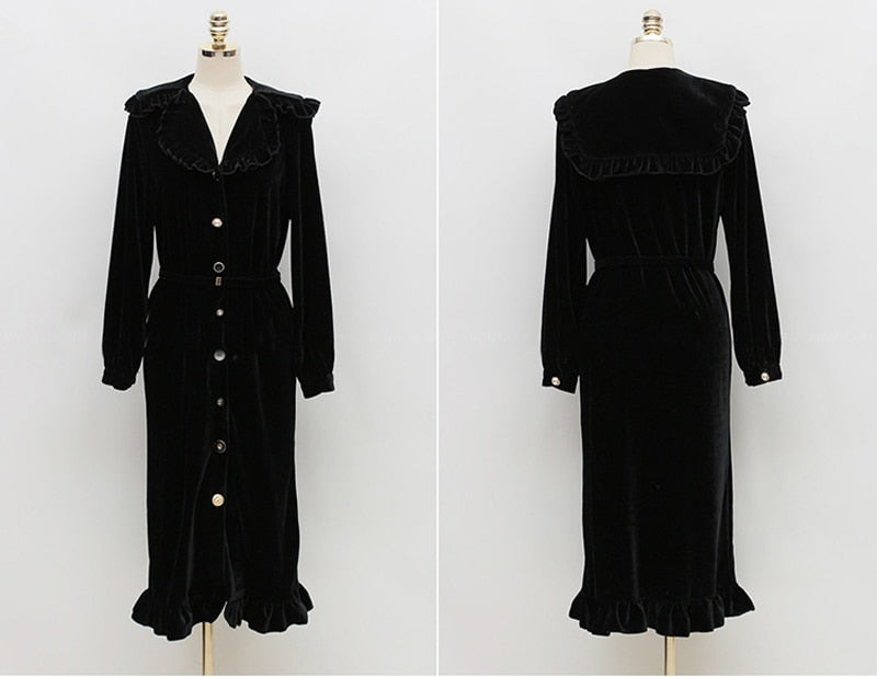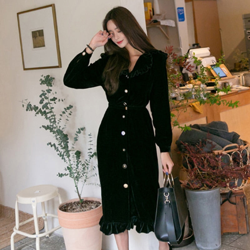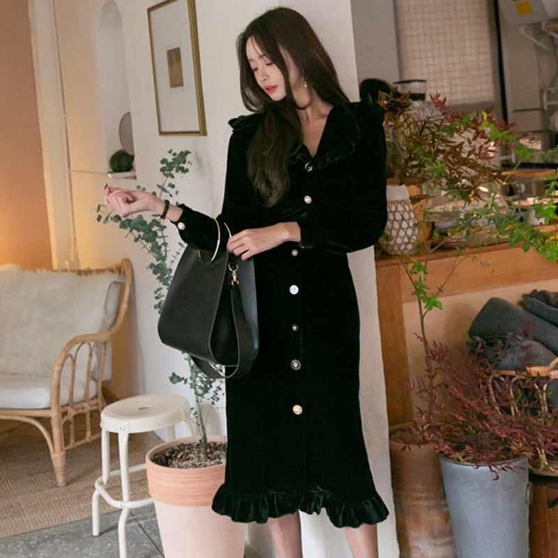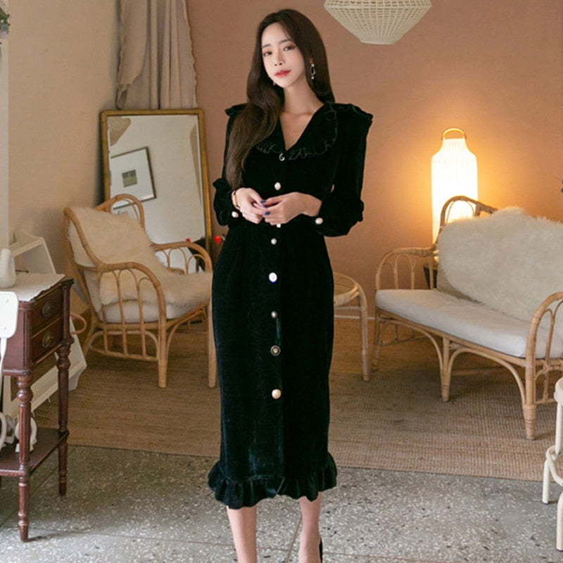 Polyester Spandex Cotton Velvet Mid-Calf Ruffles Decoration Dress