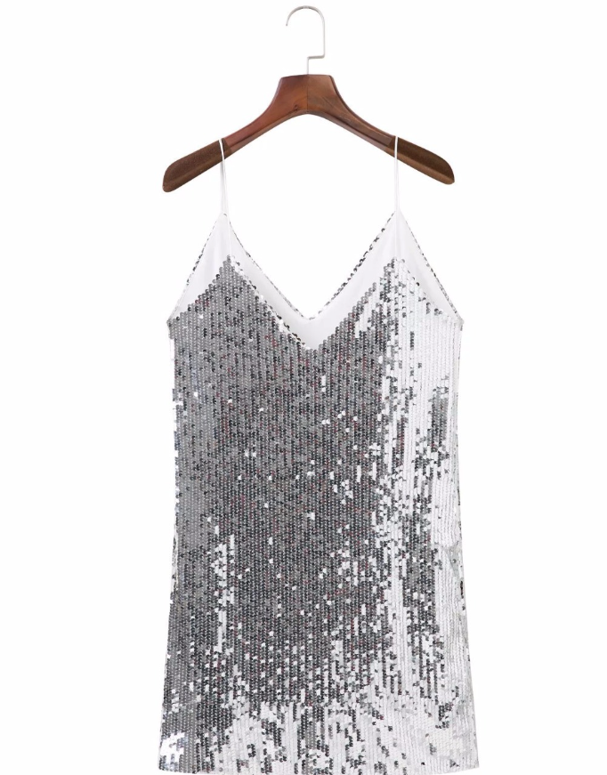 This sleeveless mini dress is a great choice for a stylish look that you can wear for a night party. The spaghetti strap design is a simple yet stylish feature that adds a touch of chic style. The v-neckline gives a feminine touch to this silver piece.