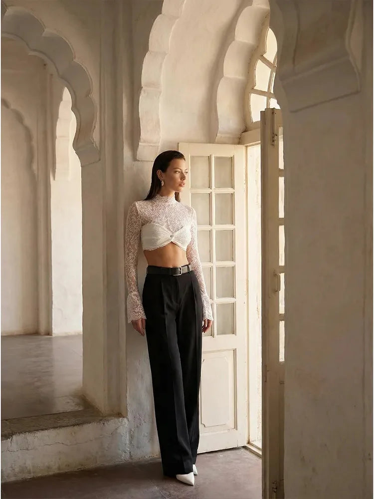 Elevate your wardrobe with this elegant flared long sleeve lace crop top. The delicate lace detailing adds a touch of sophistication, while the flared sleeves create a flattering, feminine silhouette. Perfect for layering or wearing solo, this versatile piece transitions seamlessly from casual outings to evening occasions.