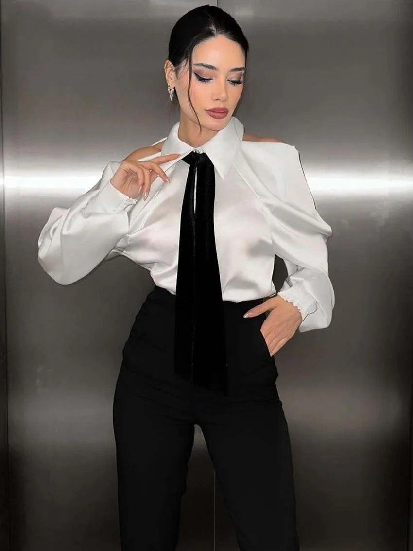 Effortless style meets comfort in this off-shoulder casual shirt. Crafted from soft polyester with a loose. The turn-down collar and single-breasted closure create a timeless look, while unique patchwork detailing adds visual interest. Full sleeves and midweight fabric make it perfect for layering or wearing solo. A versatile wardrobe essential for casual outings and everyday wear.
