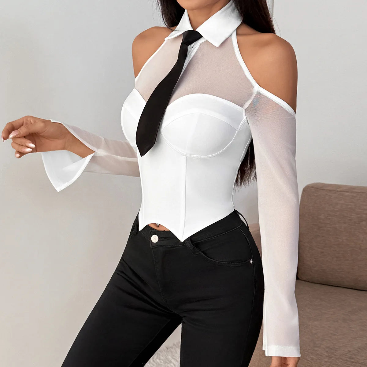 Elevate your style with this striking off-shoulder corset top, designed to turn heads. The sheer mesh sleeves add an alluring touch of sophistication, while the structured corset bodice provides flattering support and definition. Perfect for nights out, special occasions, or when you want to make a bold fashion statement. The delicate mesh detailing balances elegance with edge, creating a versatile piece that works beautifully layered or worn solo.
