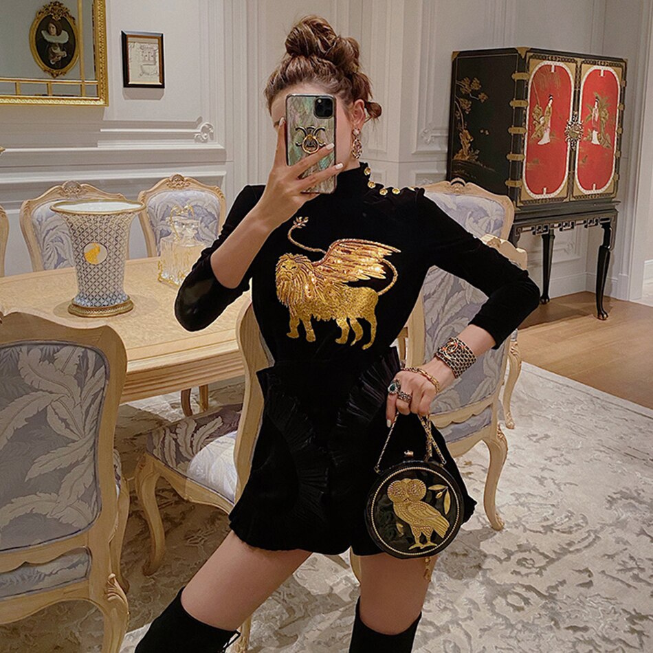 Turtleneck Collared T-Shirt with Full Sleeve and Embroidery Decoration