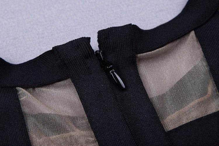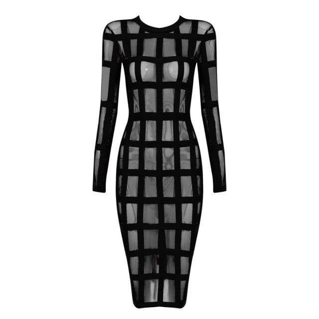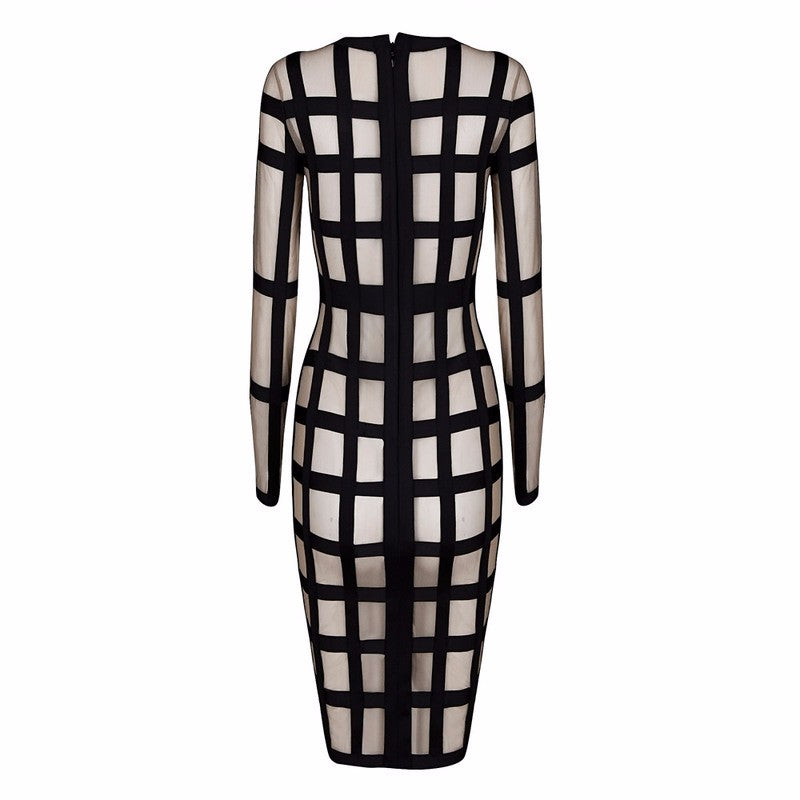 Long-Sleeved See Through Mini Dress with Grid Pattern