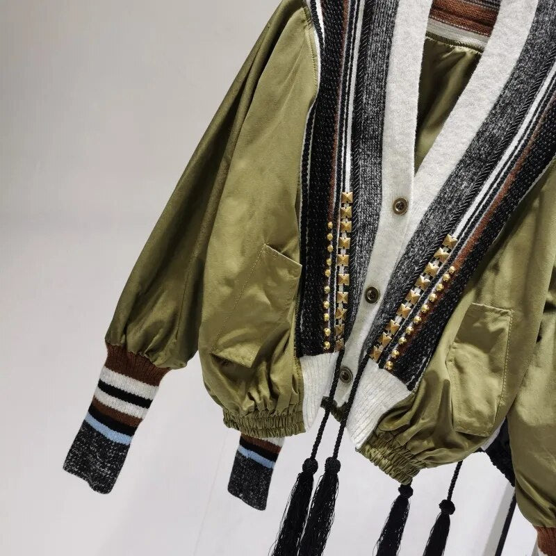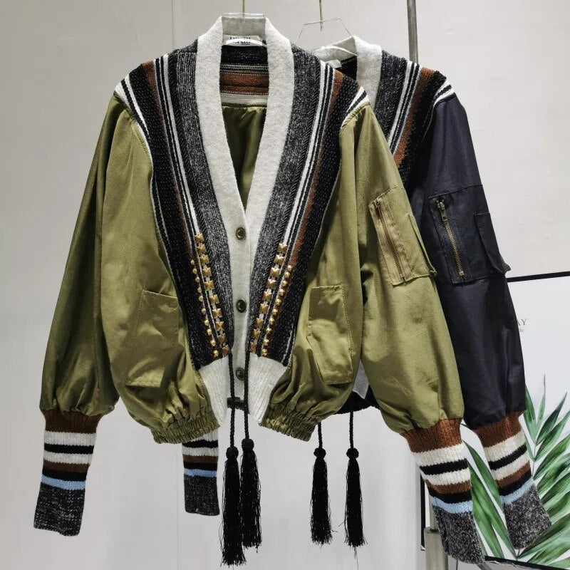 This jacket is composed of polyester. It features a unique patchwork style and two side pockets. This durable, fashionable jacket is sure to become a go-to item in your wardrobe.