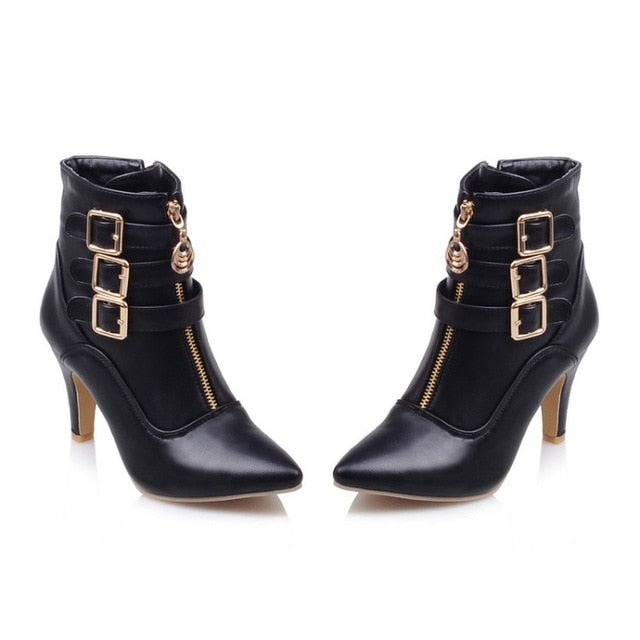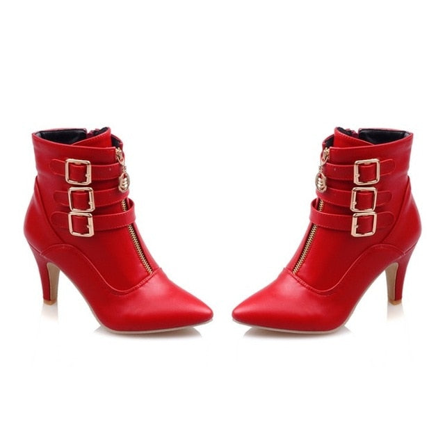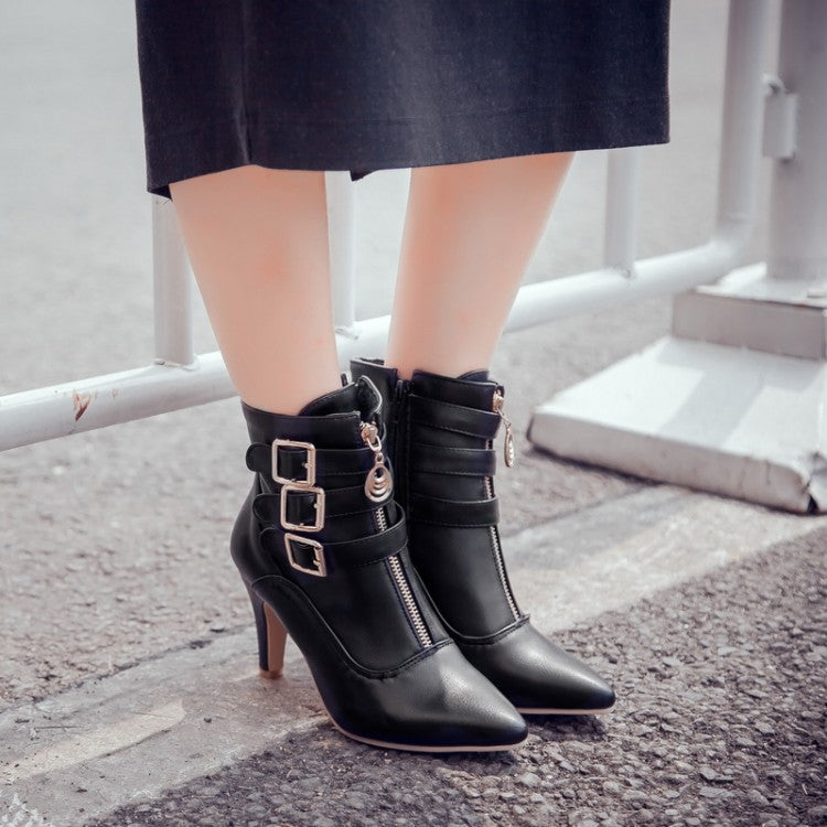 Soft Leather Triple Buckle Strap Pointed Toe Ankle Boots