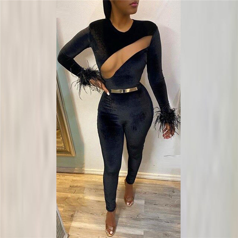 Skinny Fit Jumpsuit with Solid Color, Hollow Out Decoration, and Polyester Spandex Material