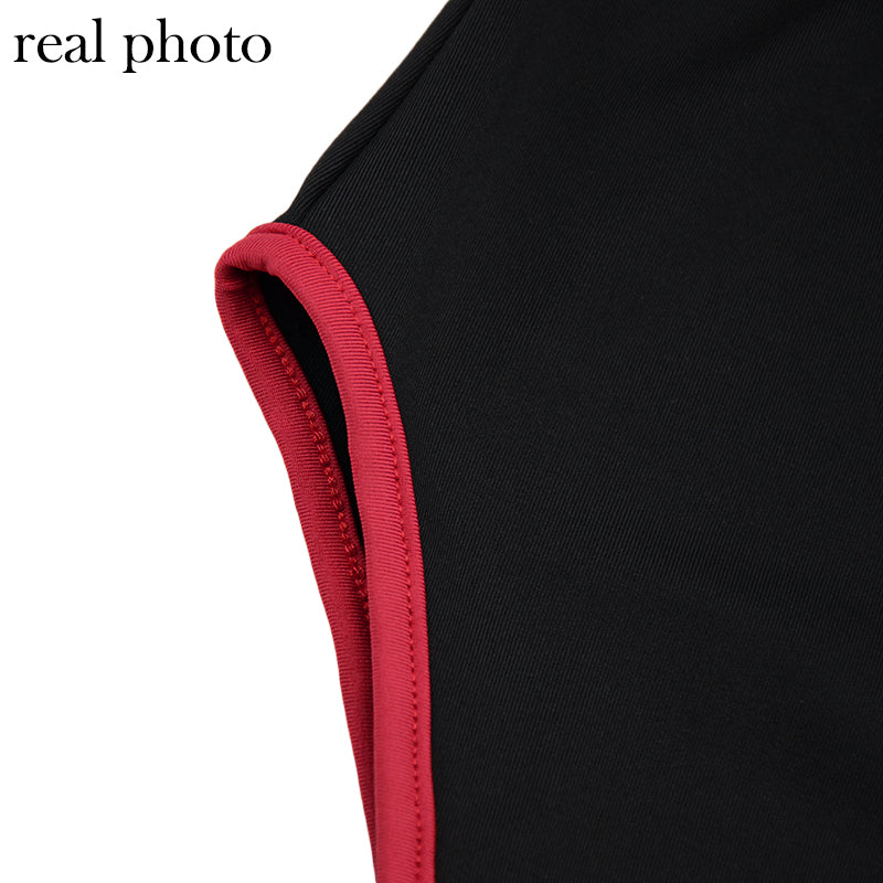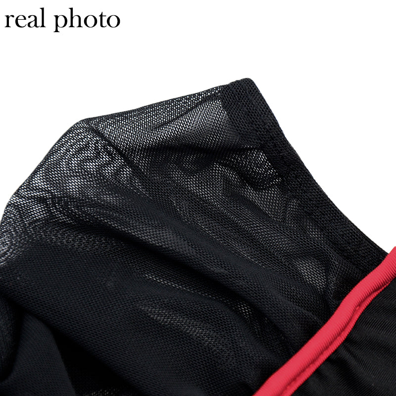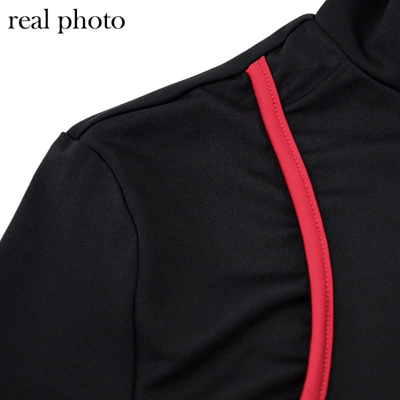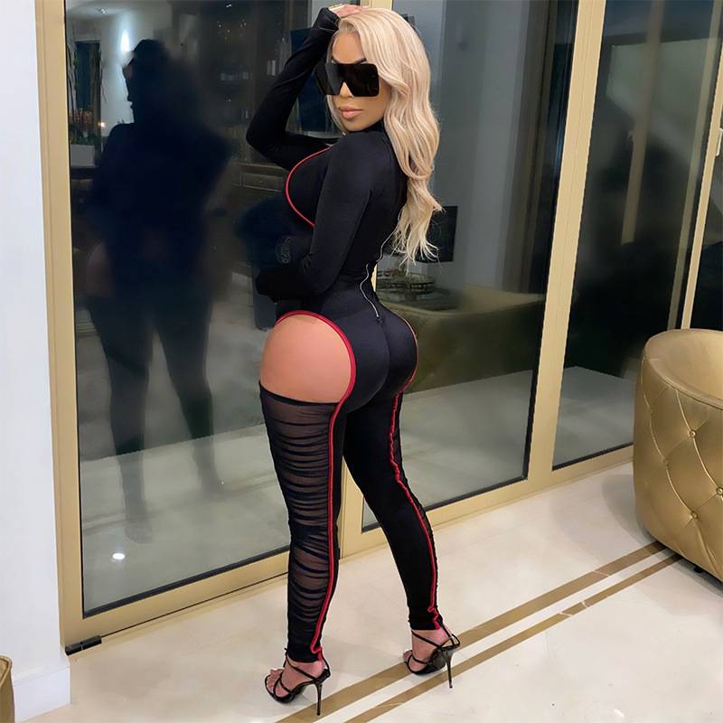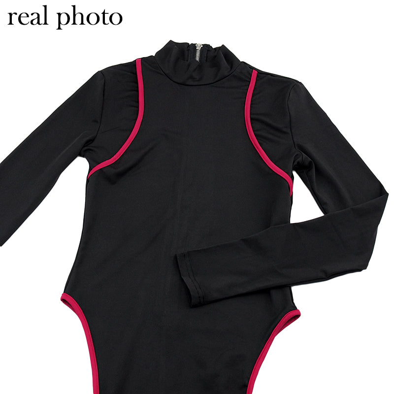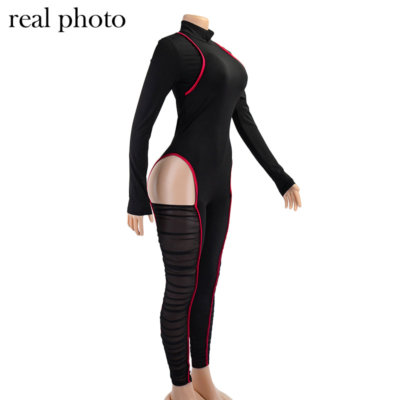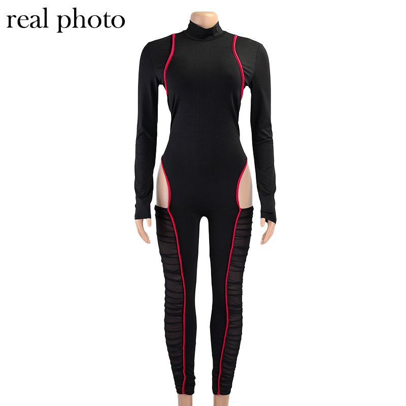 Solid See-Through Long-Sleeved Turtleneck Polyester Spandex Jumpsuit with Hollow-Out and Contrast Line Design