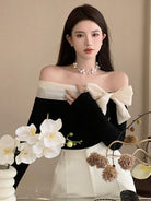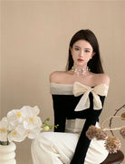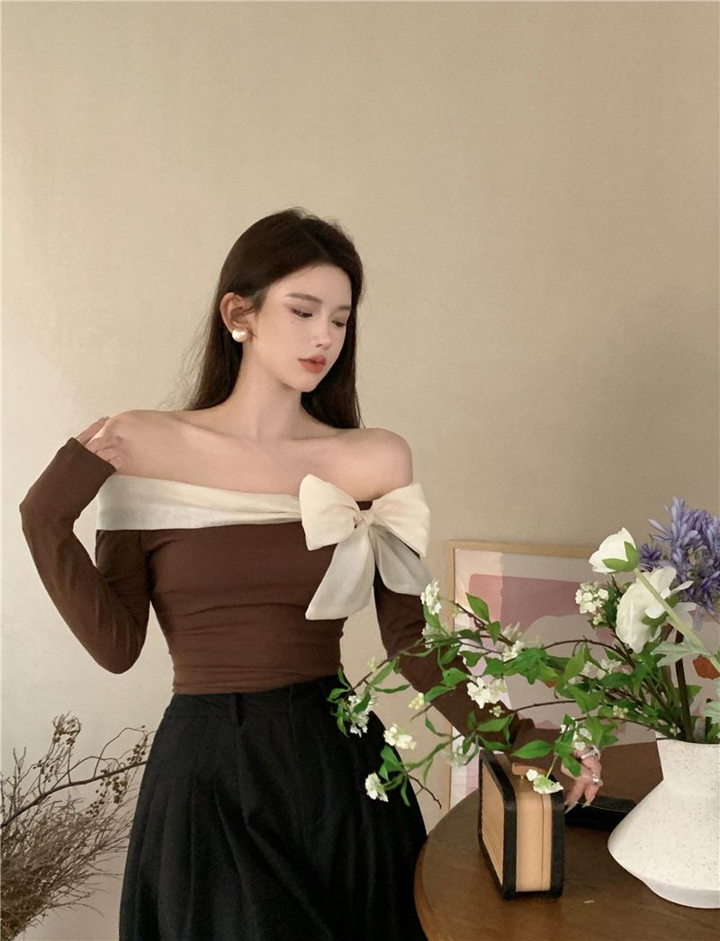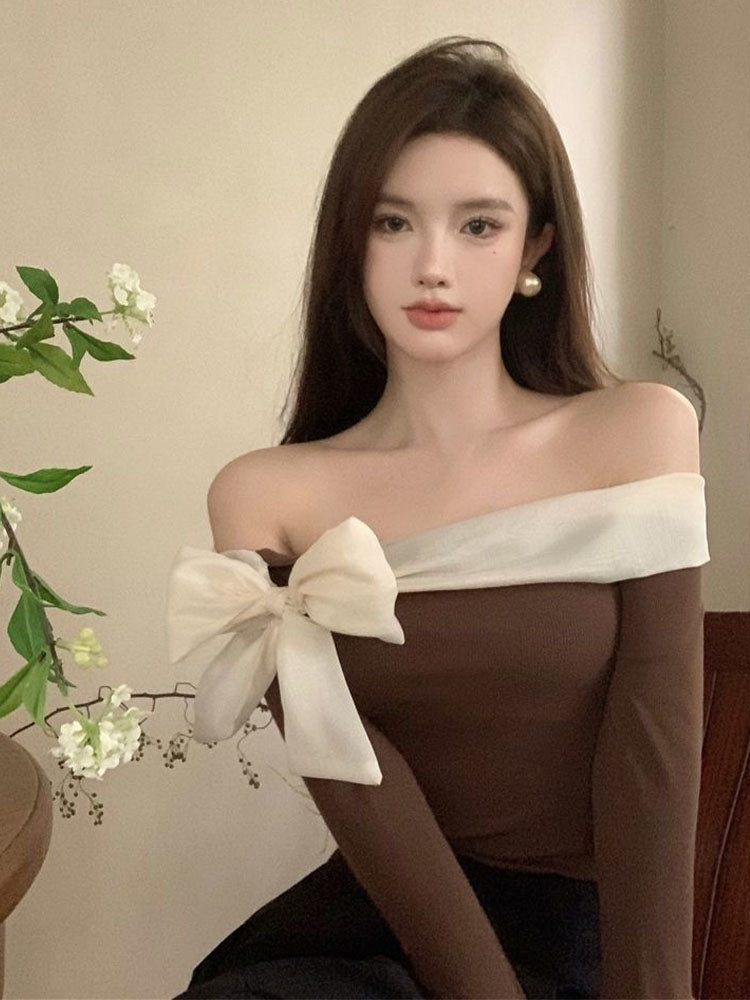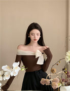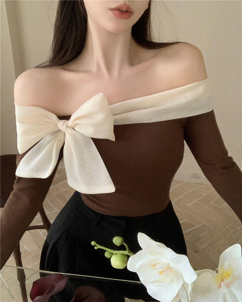 This off-shouldered blouse boasts a slash-style band neckline, accented in a contrast hue and punctuated with a grand bow. Its long sleeves make it appropriate for many events. Elevate any look with this beautiful blouse. It’s designed with comfort and style in mind and is sure to be a timeless item in any wardrobe.