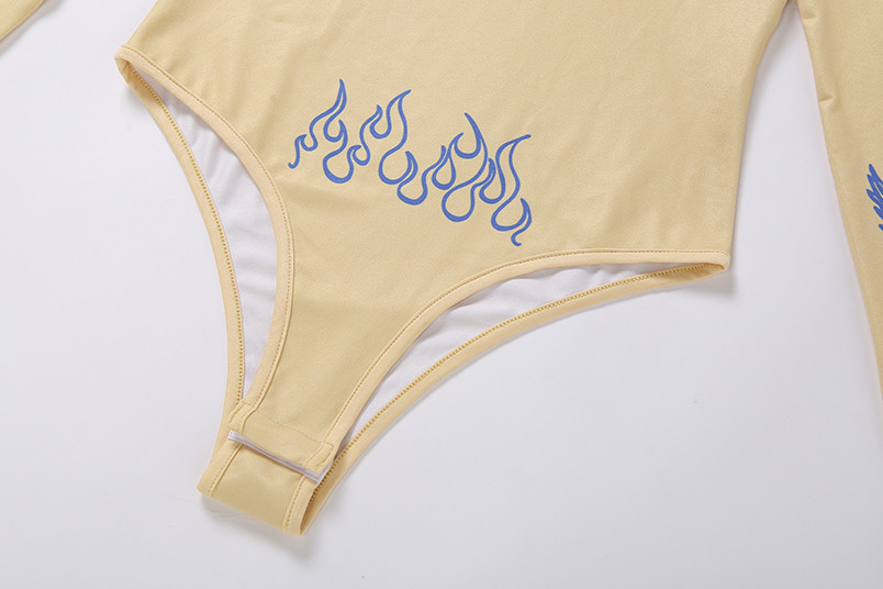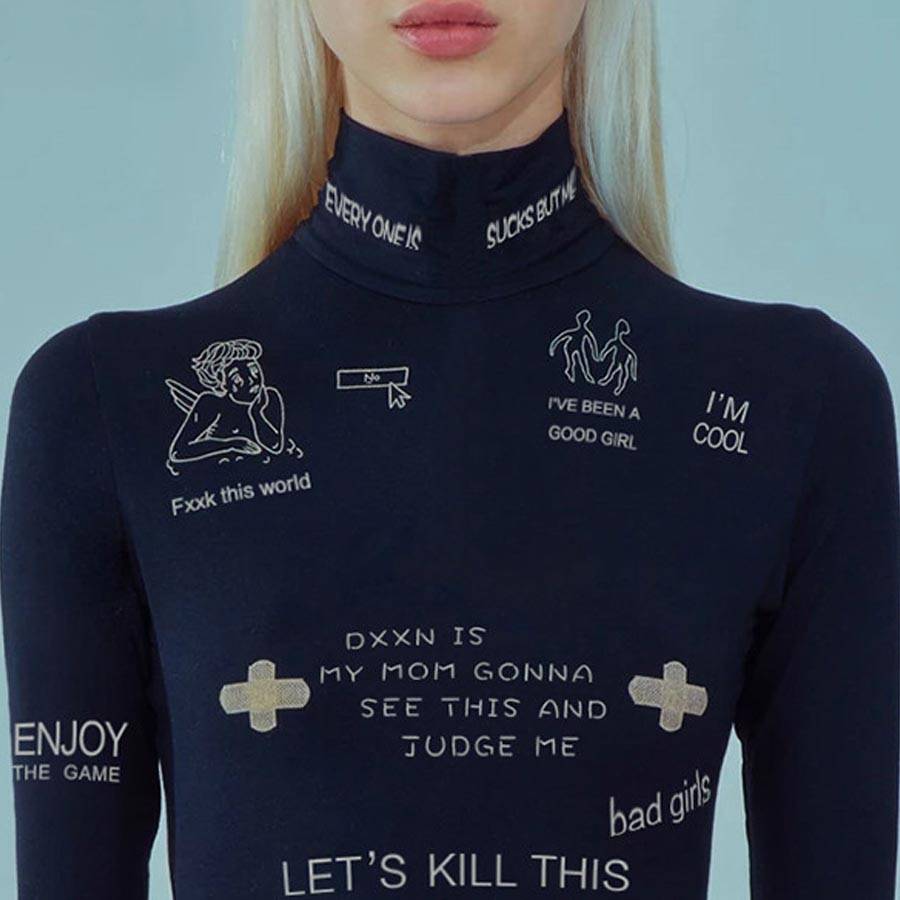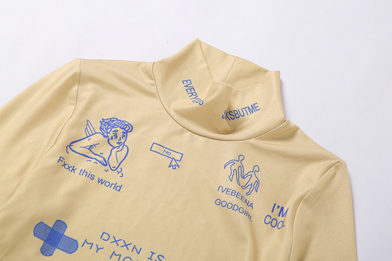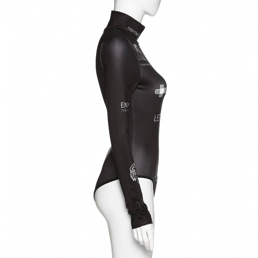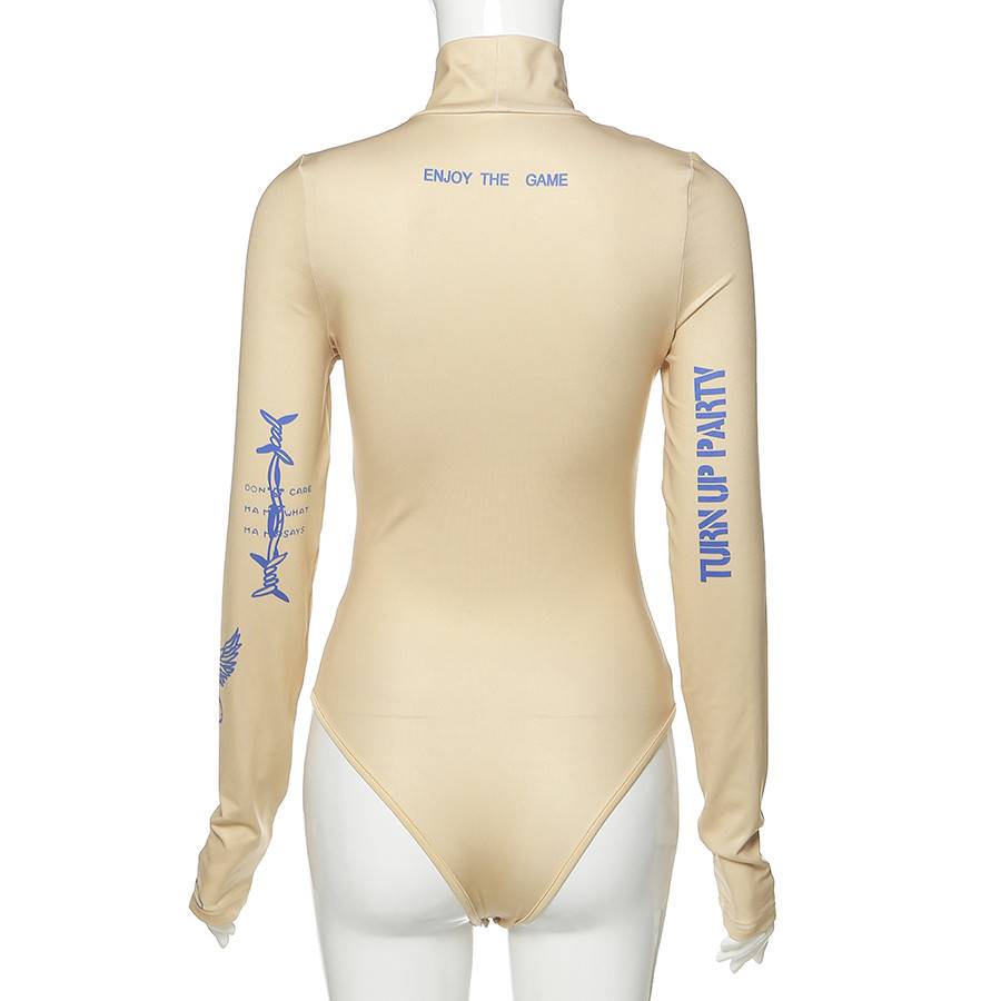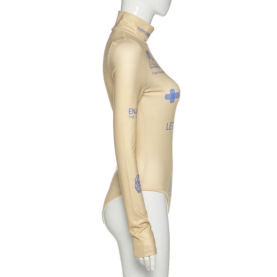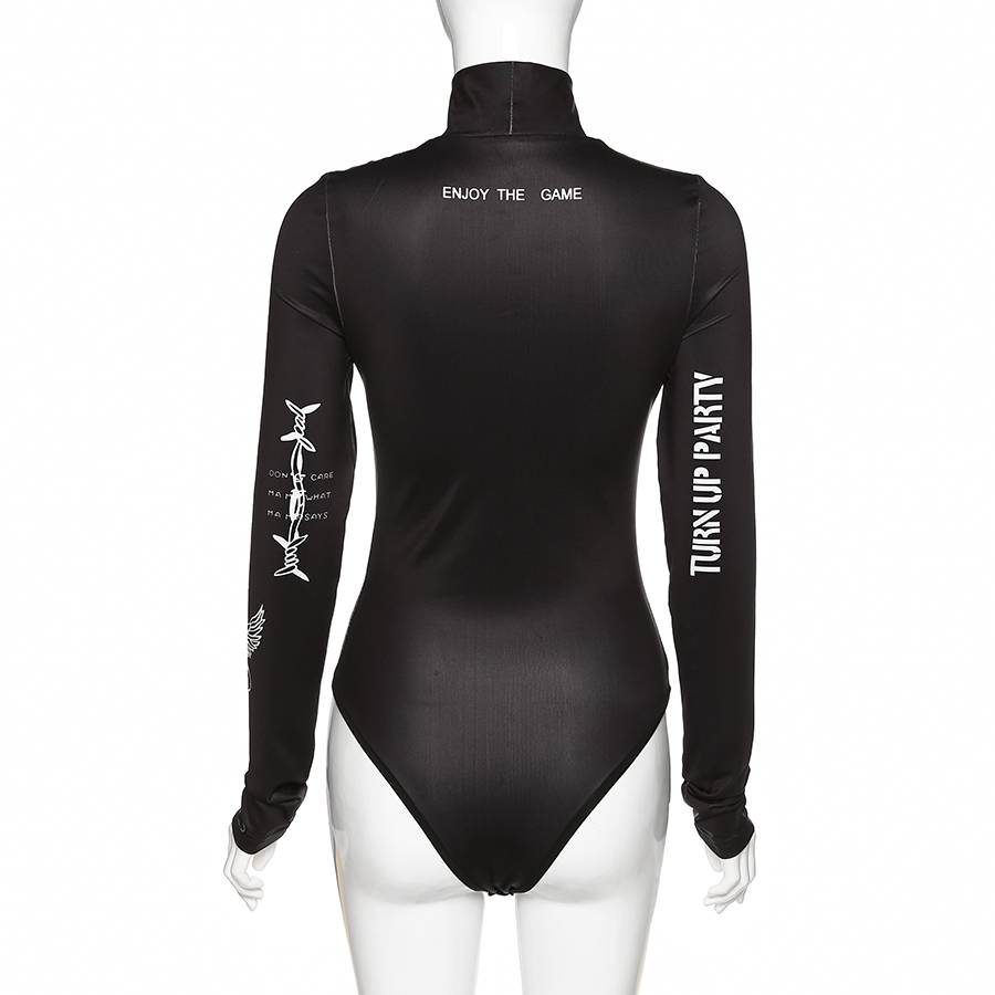 Long-Sleeved Polyester Spandex Bodysuit with Turtleneck and Letter Pattern Decoration