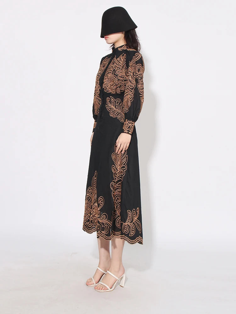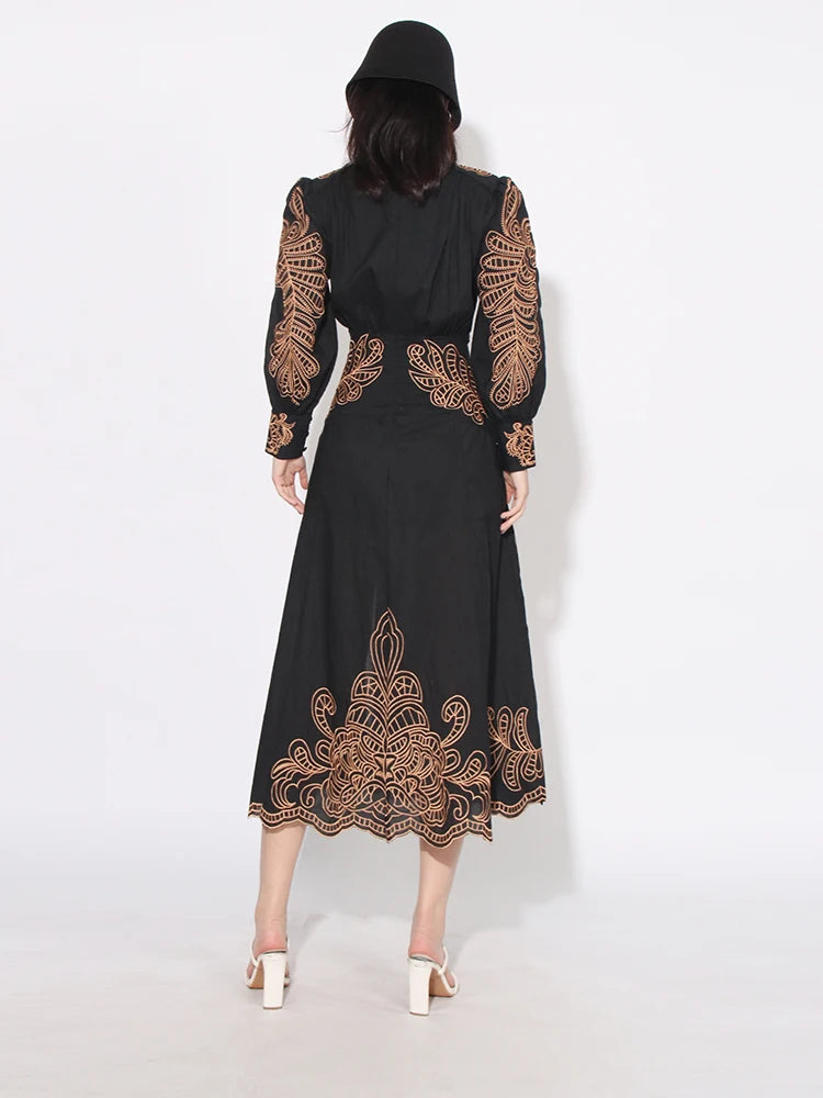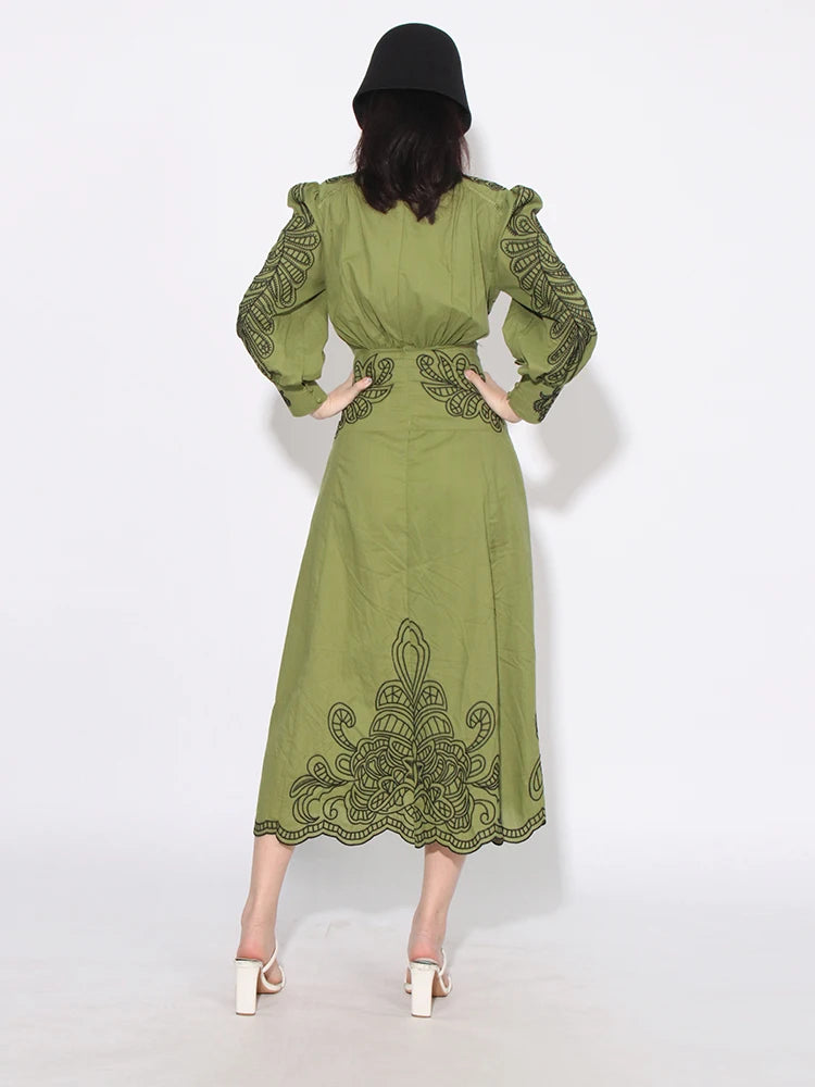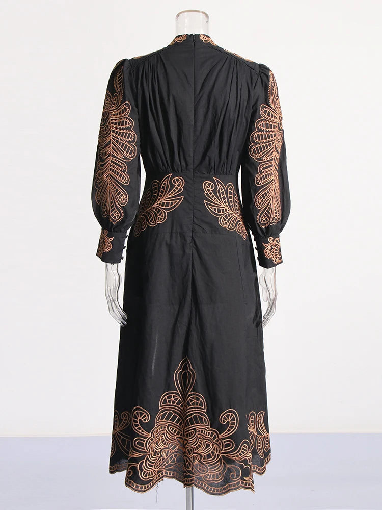 This stunning midi dress stands out with its lantern sleeves and intricate embroidery. Perfect for casual occasions with an Empire waistline and full sleeves for added style and coverage. Make a bold statement with the Call It Torture Midi Dress!