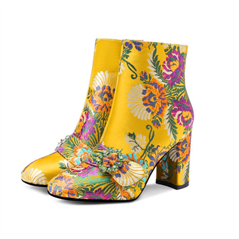 Square Toe Ankle Boots with Floral Pattern, Zipper Closure, and Silk Upper Material