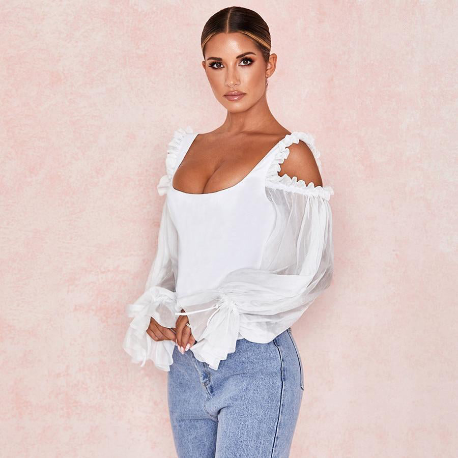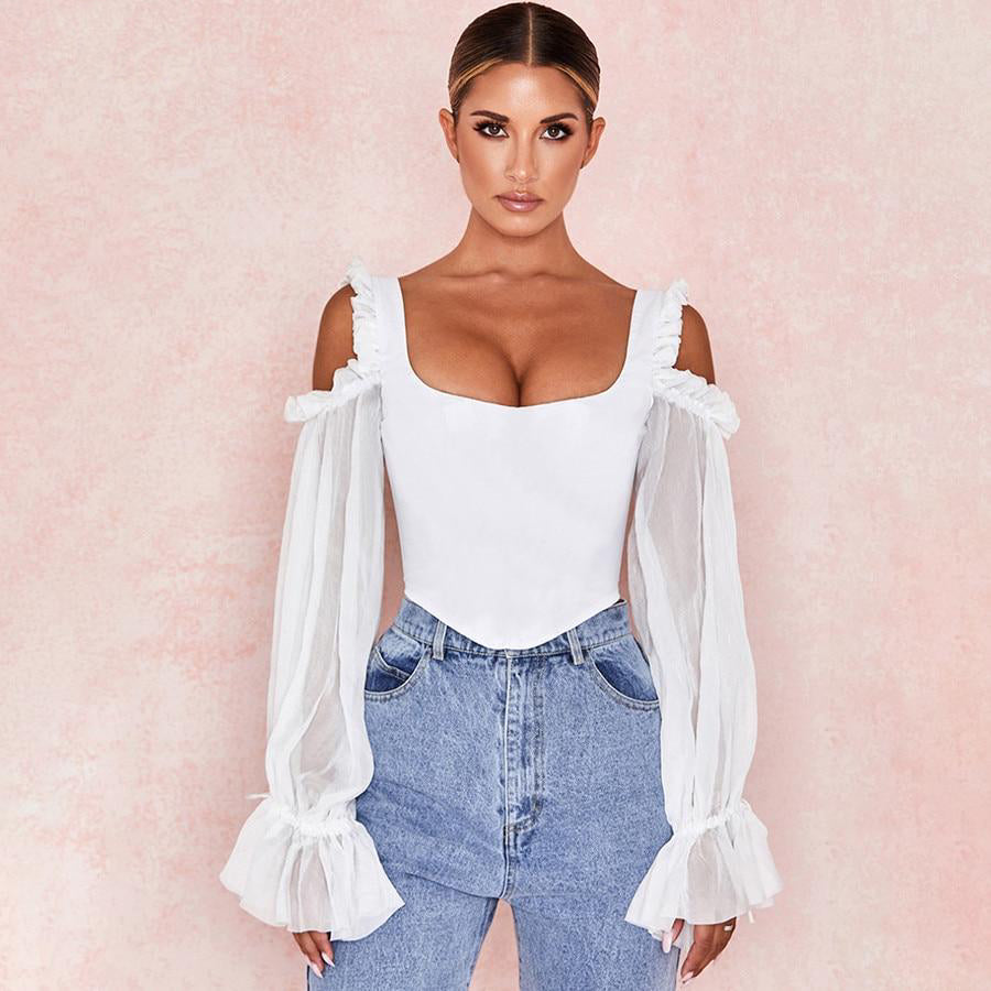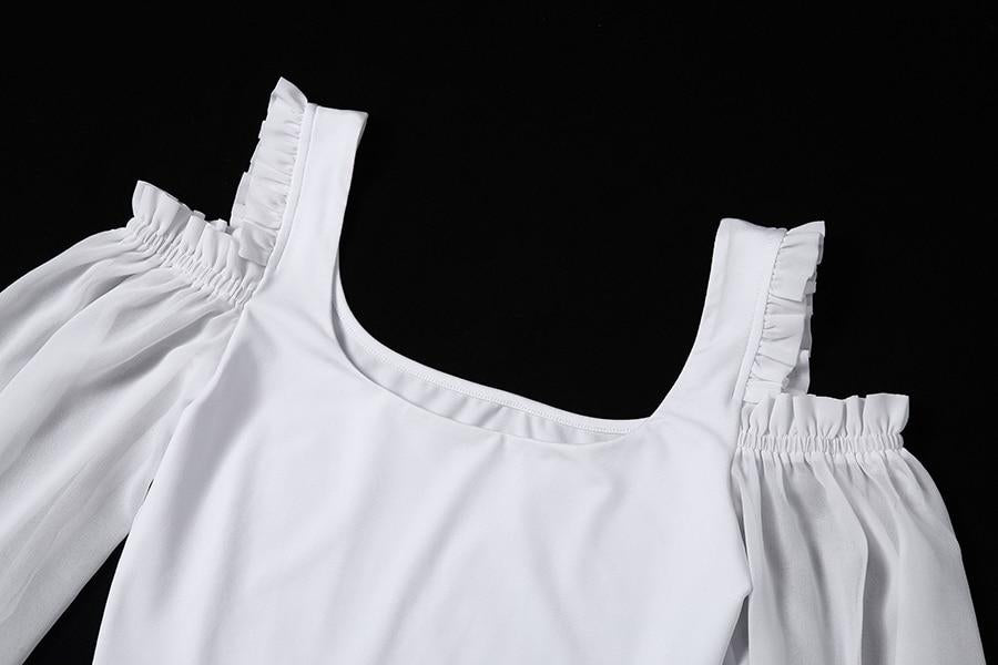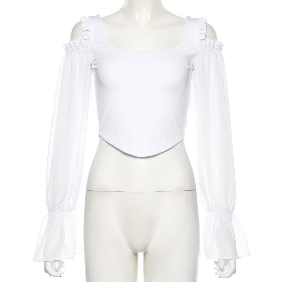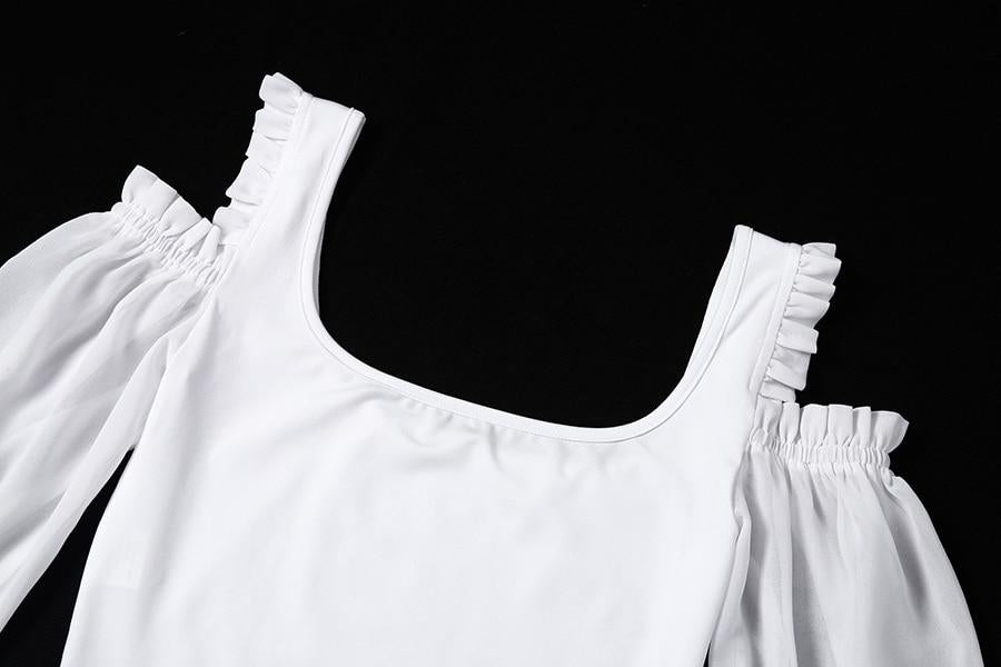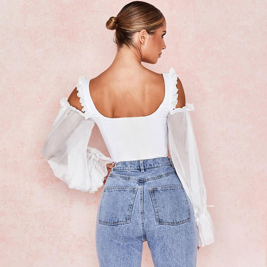 French White Off Shoulder Hollow Out Puff Sleeve Women Crop Top