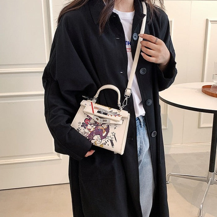 This handbag is made of PU leather. It has a cartoon printed design and a handle. It is cute and trendy. You can use this handbag for daily purpose. It is durable and sturdy.