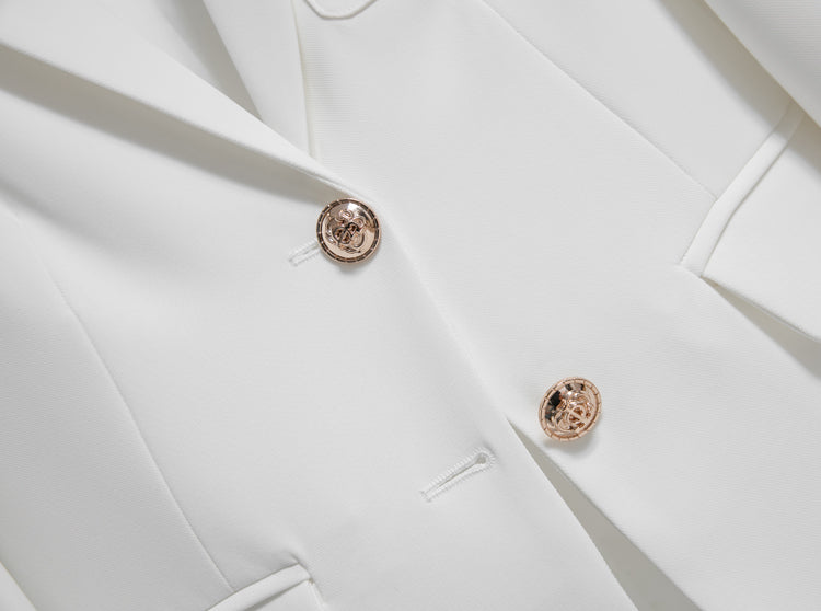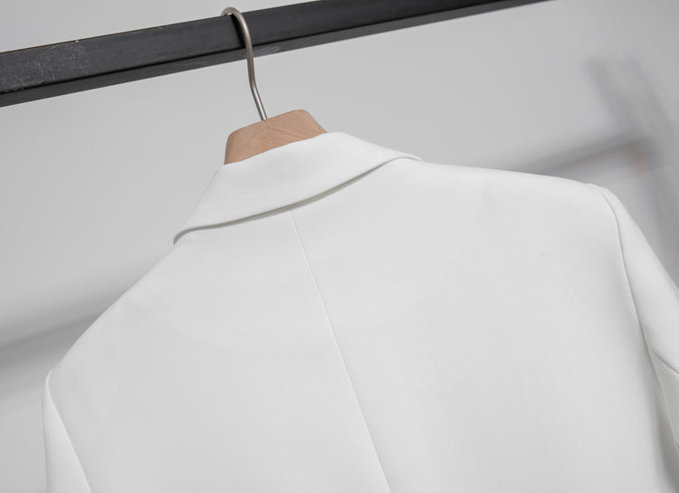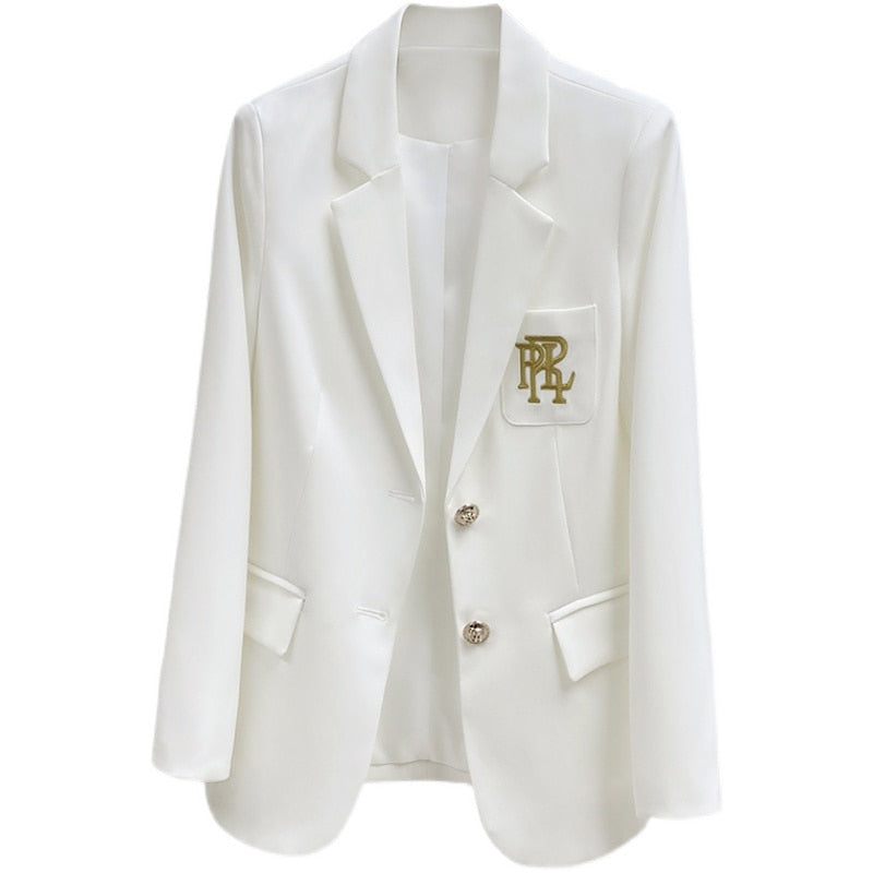 This elegant blazer is made from a blend of cotton polyester. Featuring a letter embroidery decoration, the notch lapel and double button closure also add to the sophistication of this versatile piece.