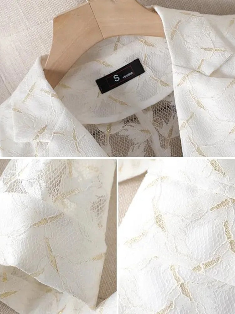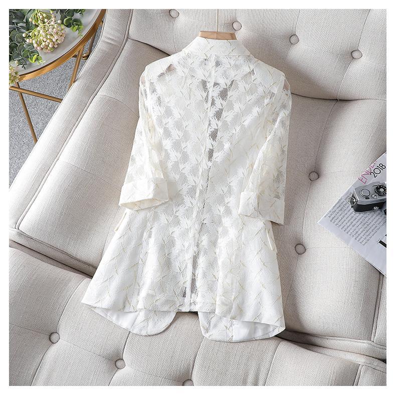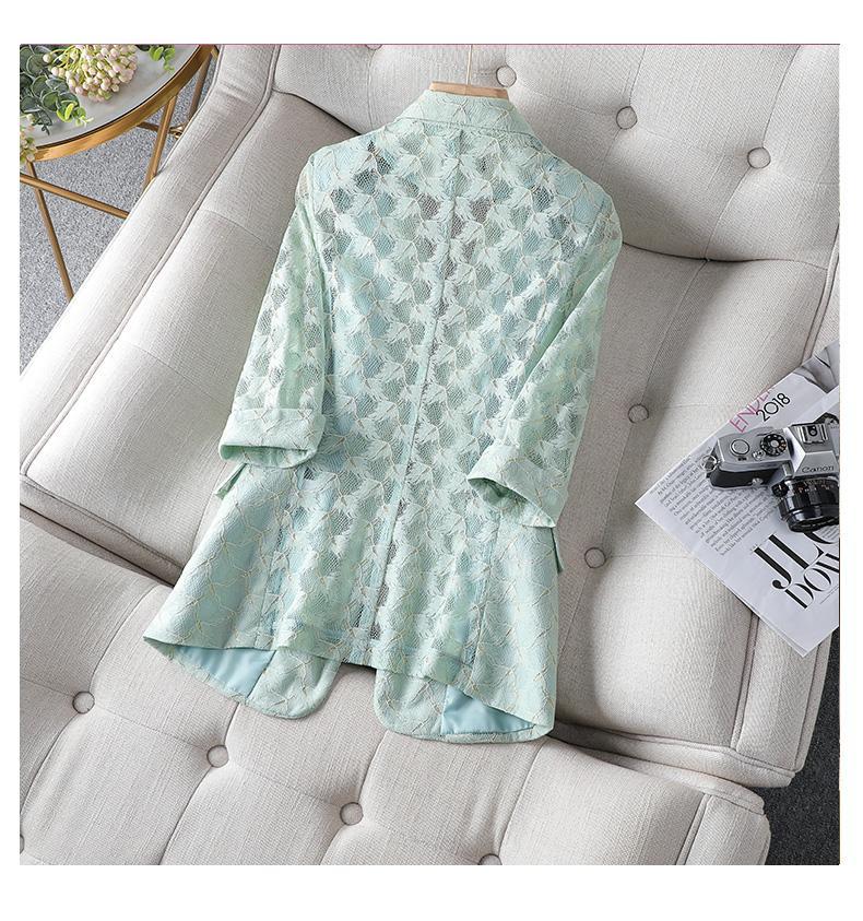 The polyester fabric is soft and comfortable, and the lace accents add a touch of femininity. The three-quarter sleeves are perfect for transitioning from winter to spring, and the single-button closure is classic. Add this blazer to your wardrobe today!