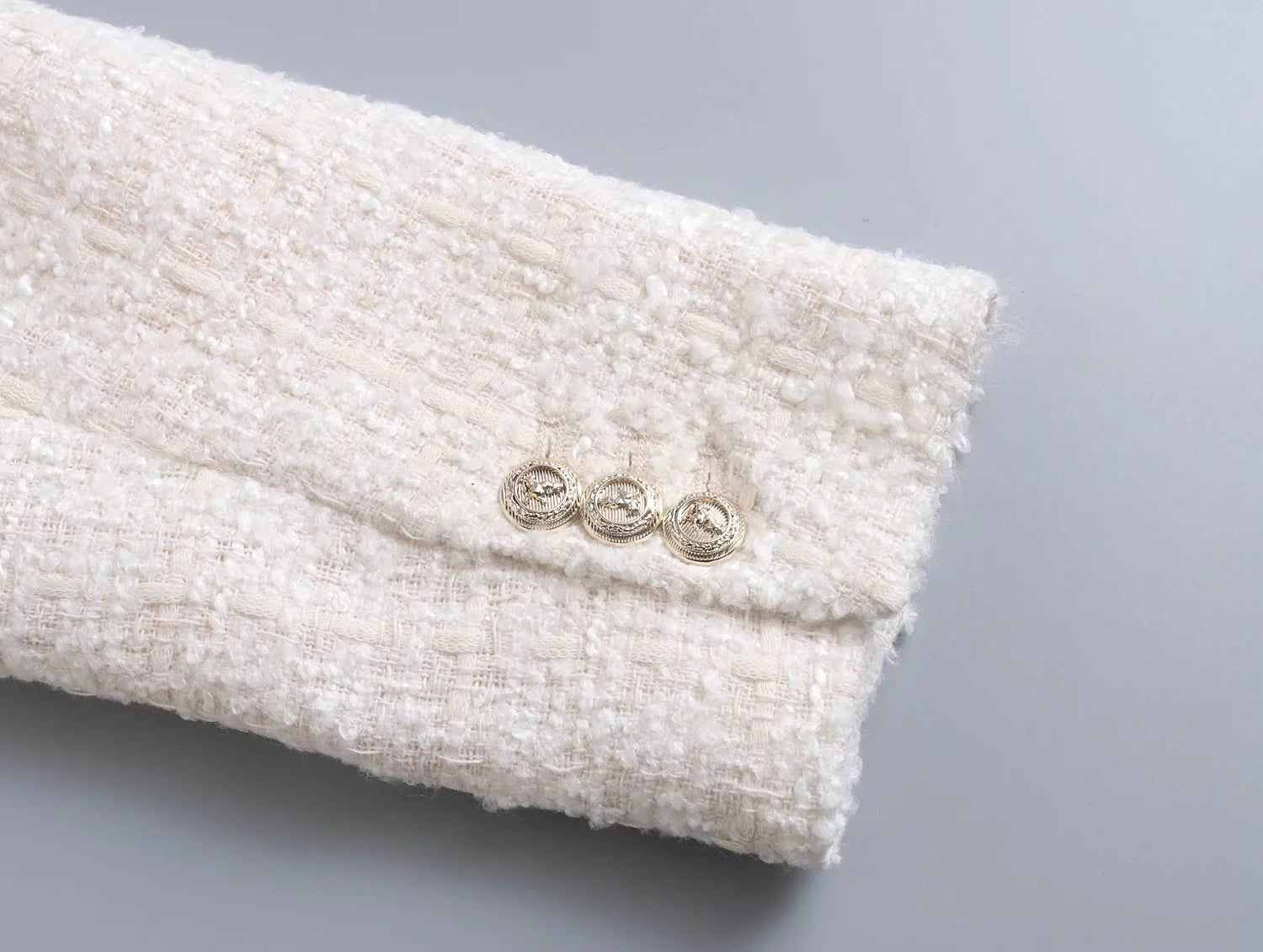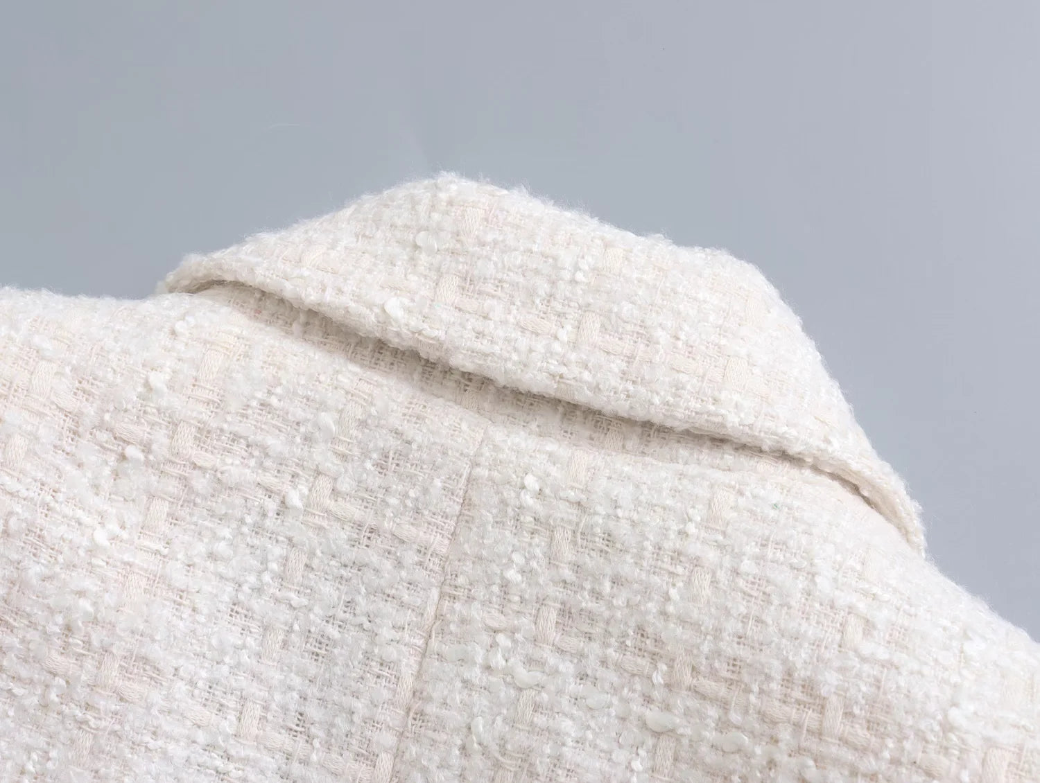 This is a classy, yet functional blazer that is perfect for women on the go. It is made of cotton and has long sleeves to keep you warm on the coldest days. The blazer is white and double-breasted with a notched collar.