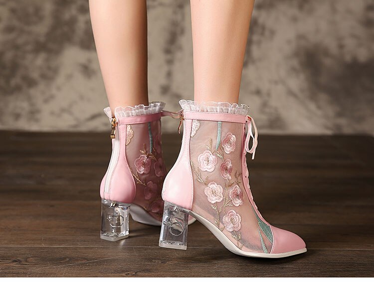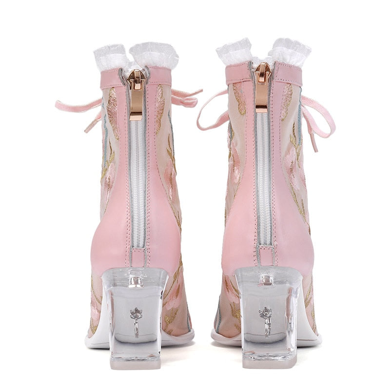 Pink Lolita Cross Tied With Zip Closure Emboridery Ankle Boots