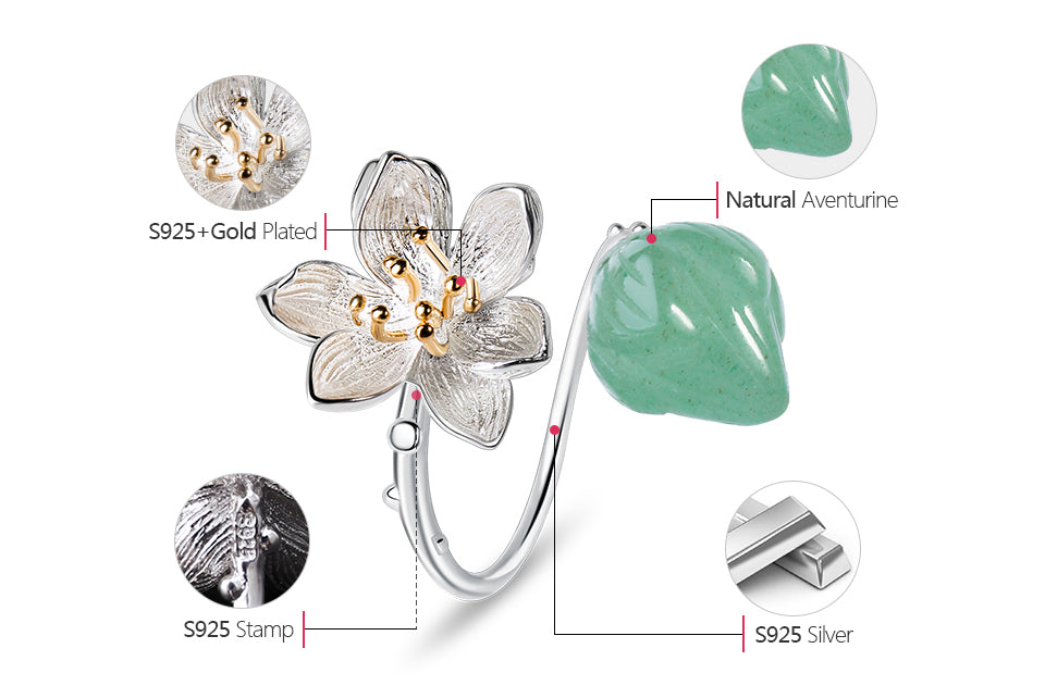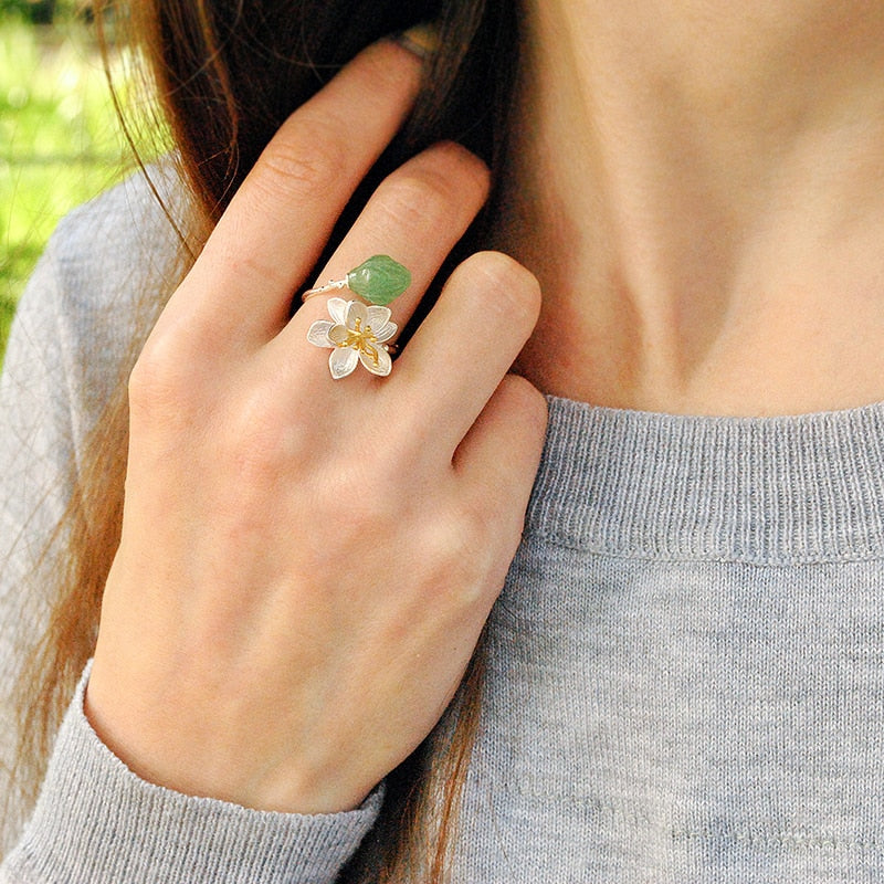 925 Sterling Silver Ring with Aventurine Stone and Unique Flower Design