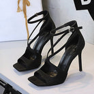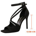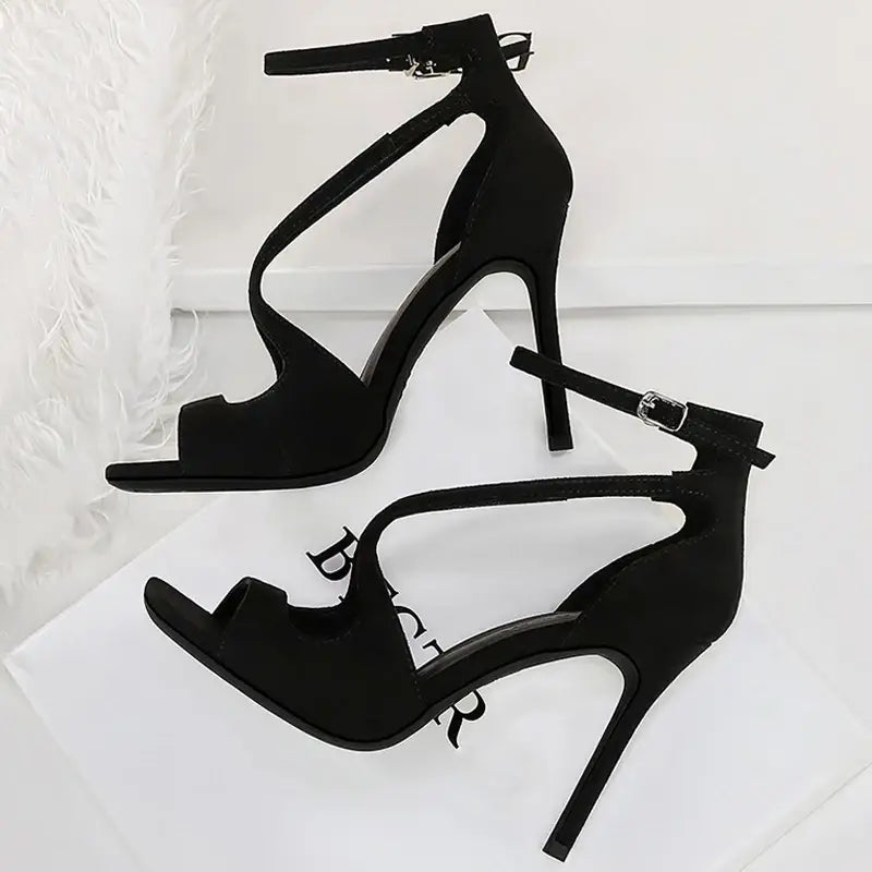 Sultry Serenade Heeled Sandals feature an open side vamp and seductive peep toe design, crafted from soft flock material. These daring shoes combine bold style with a touch of mystery, perfect for making a confident statement wherever you go.