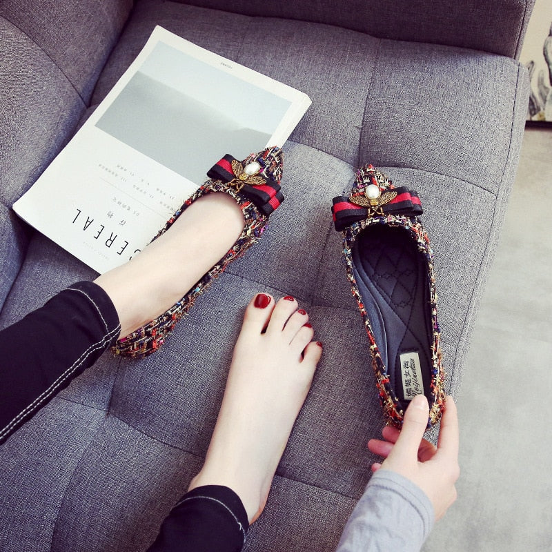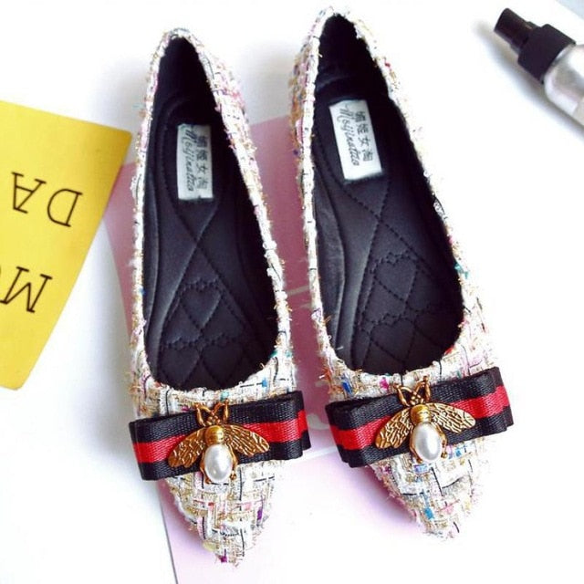 Breathable Bee Decoration Rhinestone Pointed Toe Women Flat Shoes