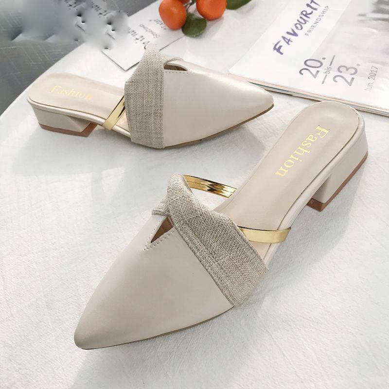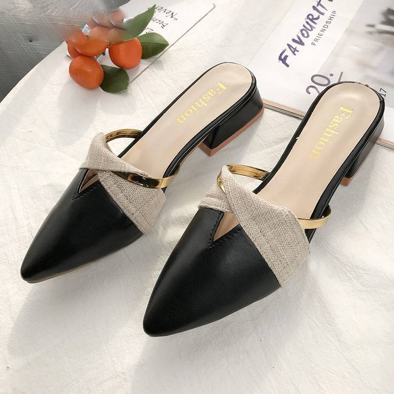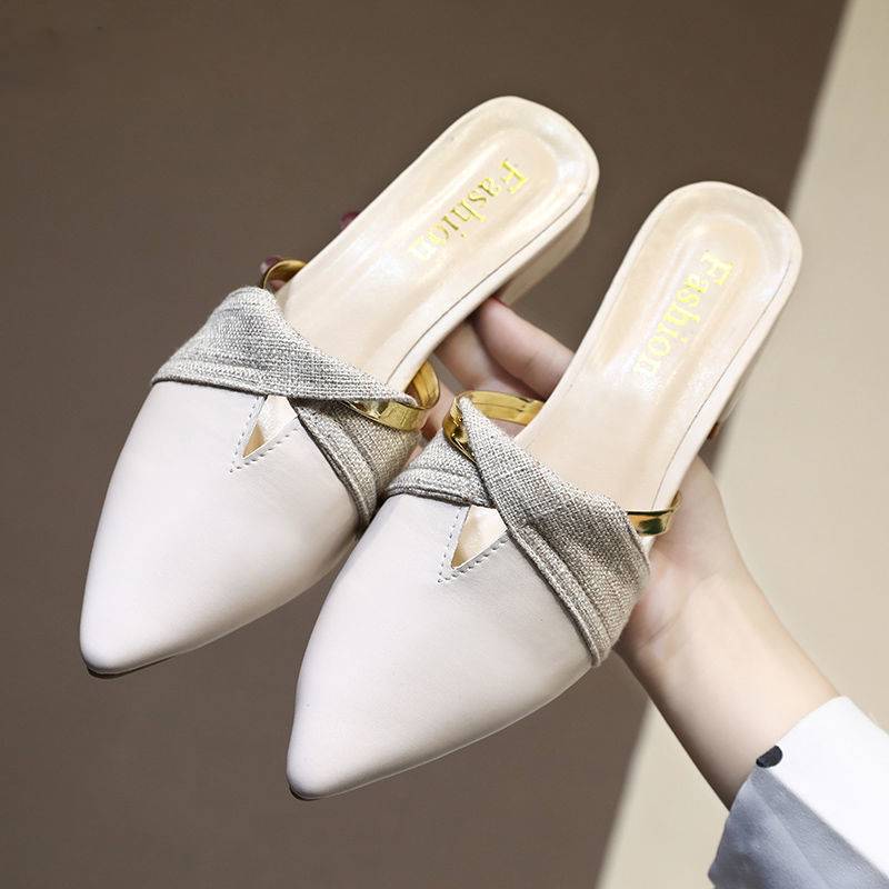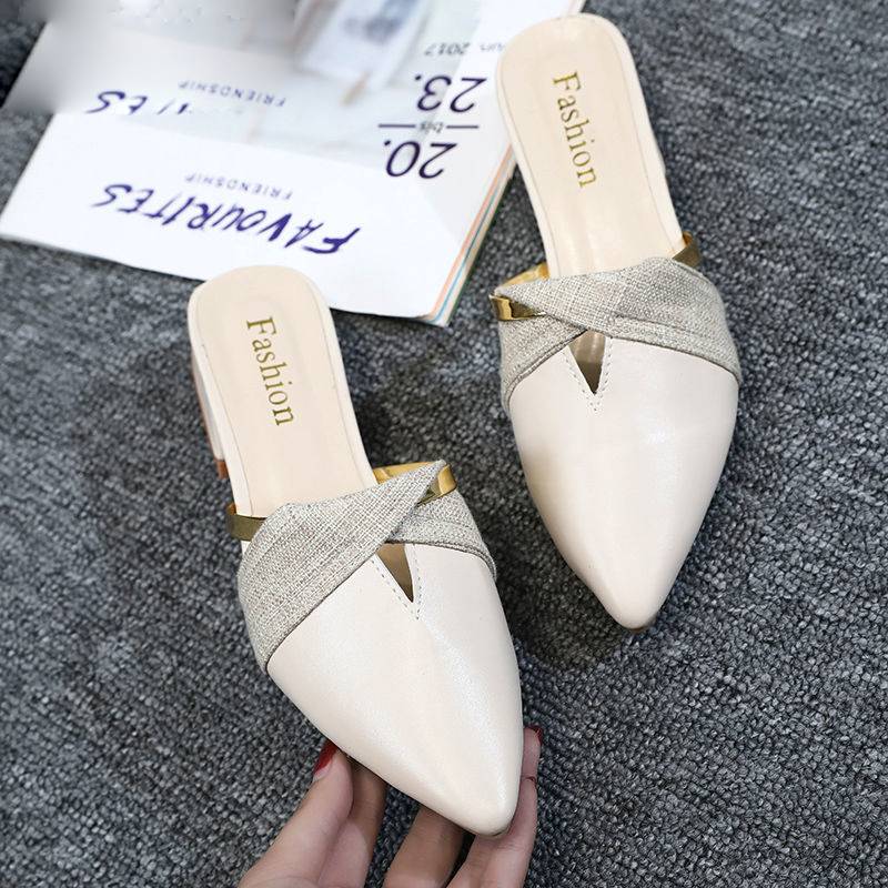 Classic PU Leather Pointed Toe Golden Ring Decoration Women Mules Shoes