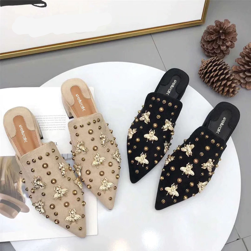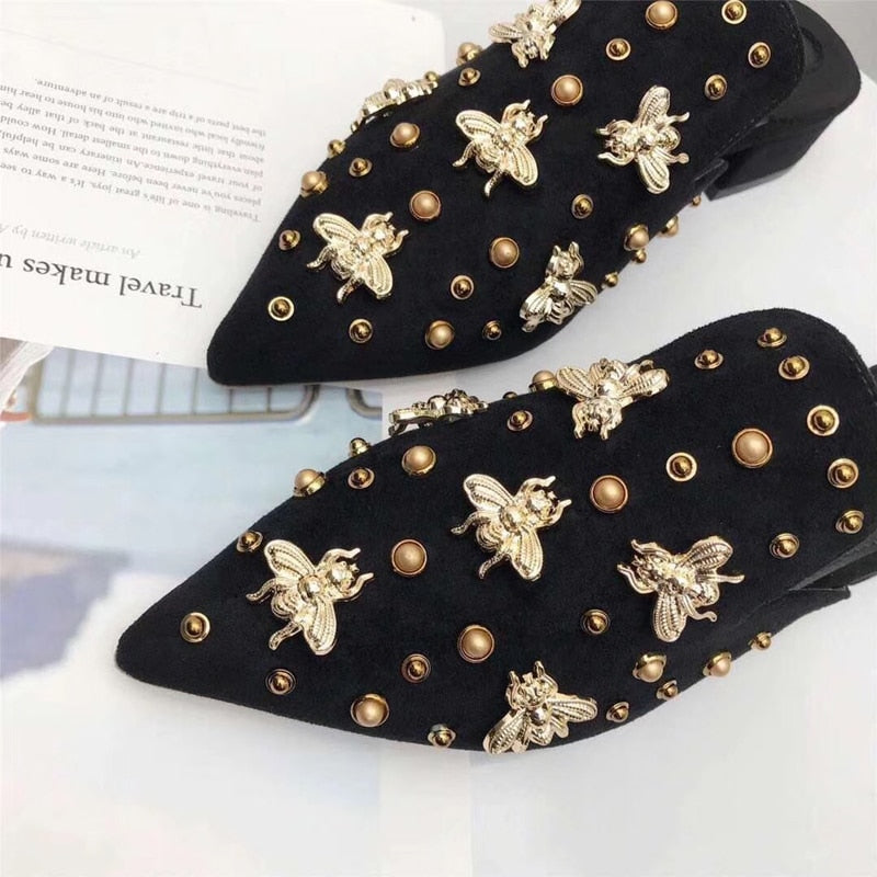 uxury Golden Bee Rivet Stud Flock Suede Spike Heels Mules Shoes