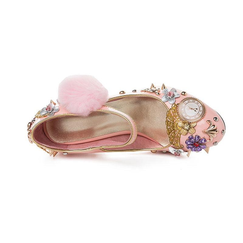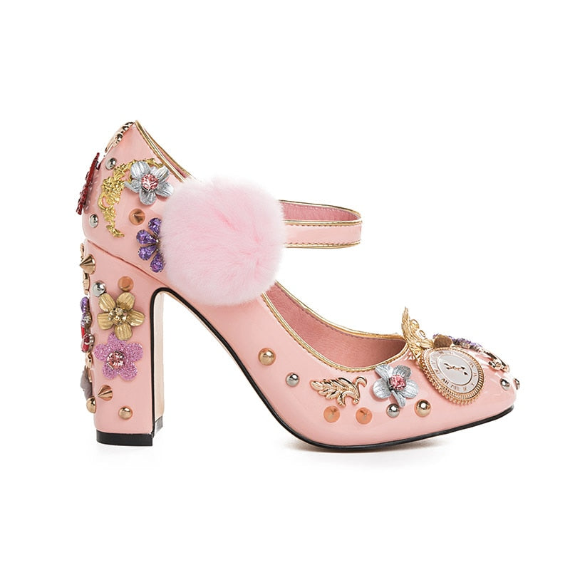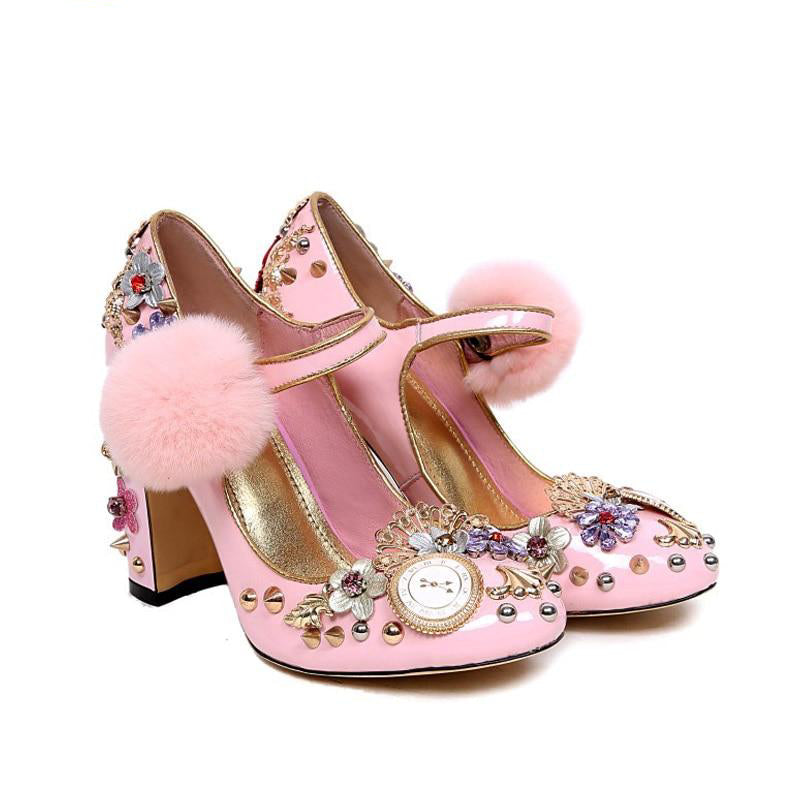 Pink Mary Janes Crystal Flower Leather Pump Shoes