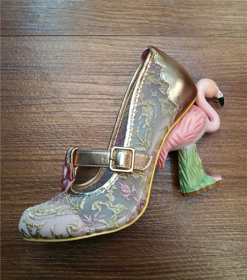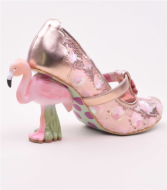 Sequined Cloth Mary Janes Pumps with Genuine Sheepskin Insole and Unique Flamingo Heels