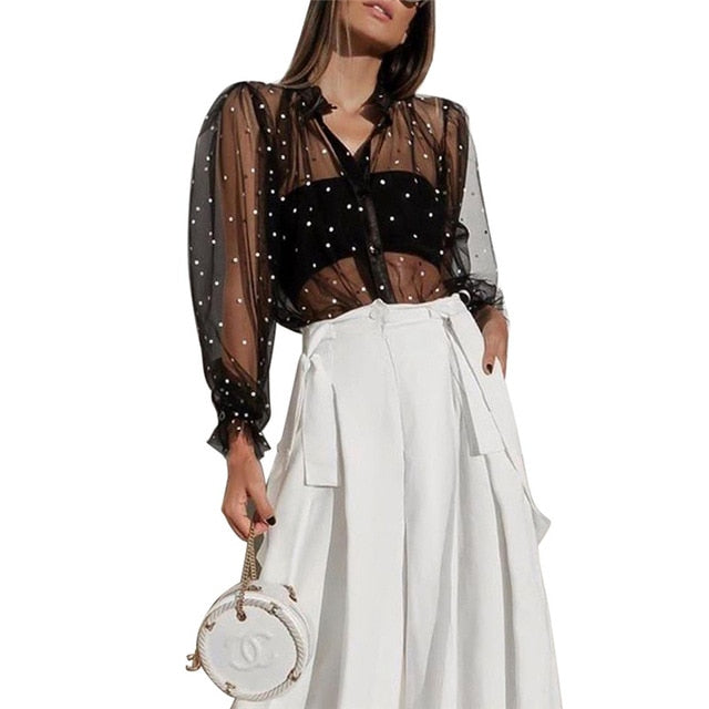 Retro Polka Dot See-Through Loose Button Big Puff Sleeve Women Blouse