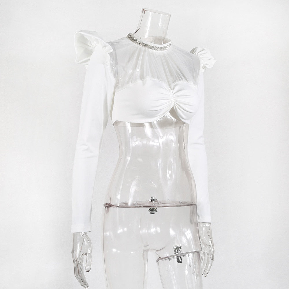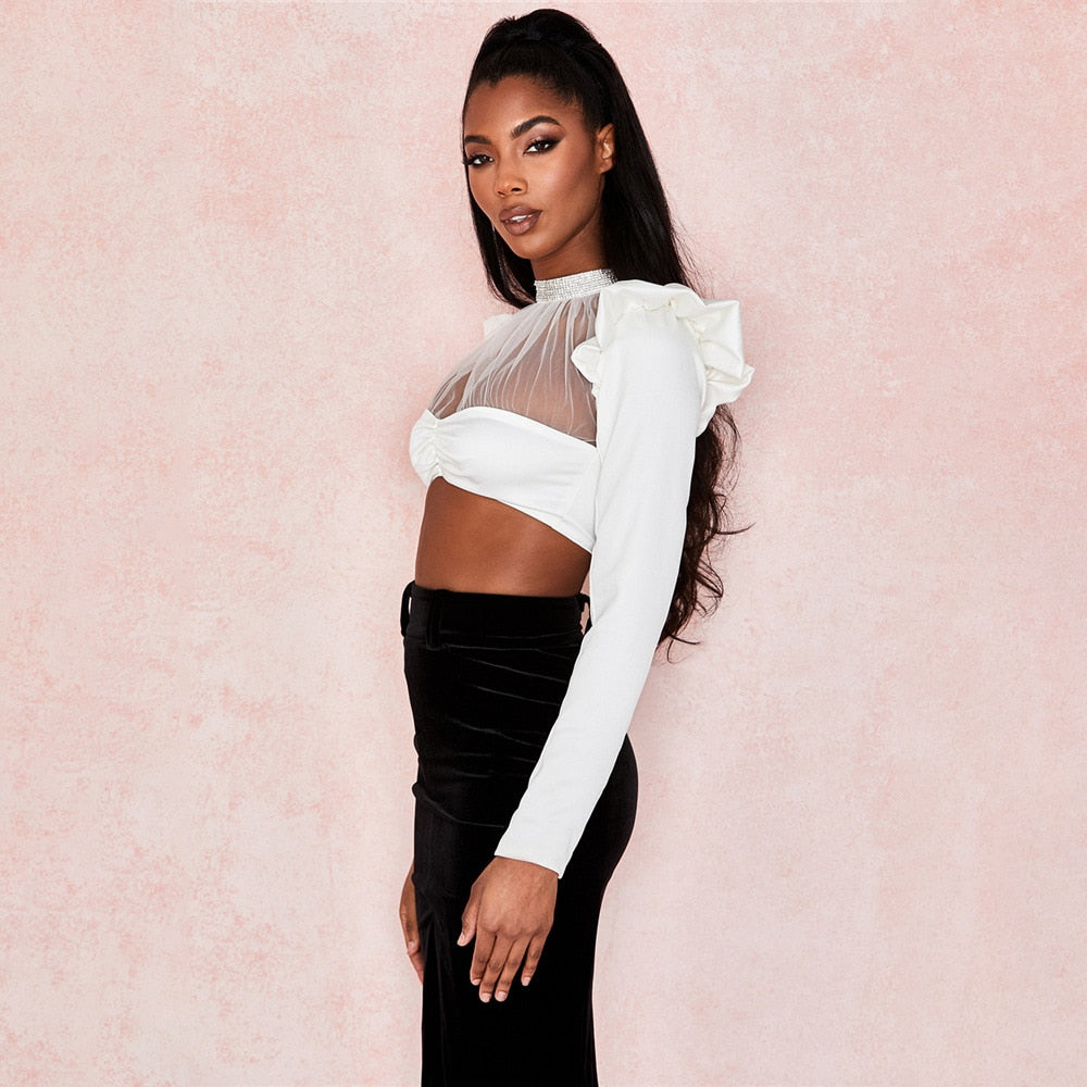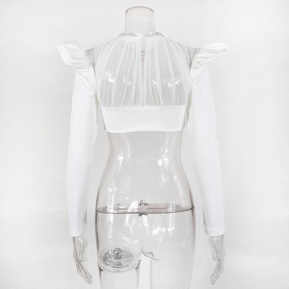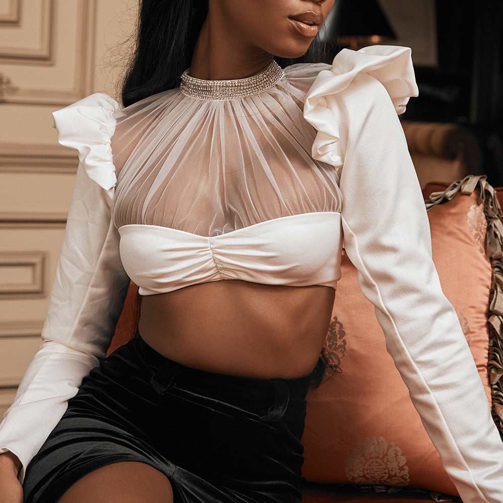 Sheer Mesh Splice Ruffle Sleeve Women Crop Top