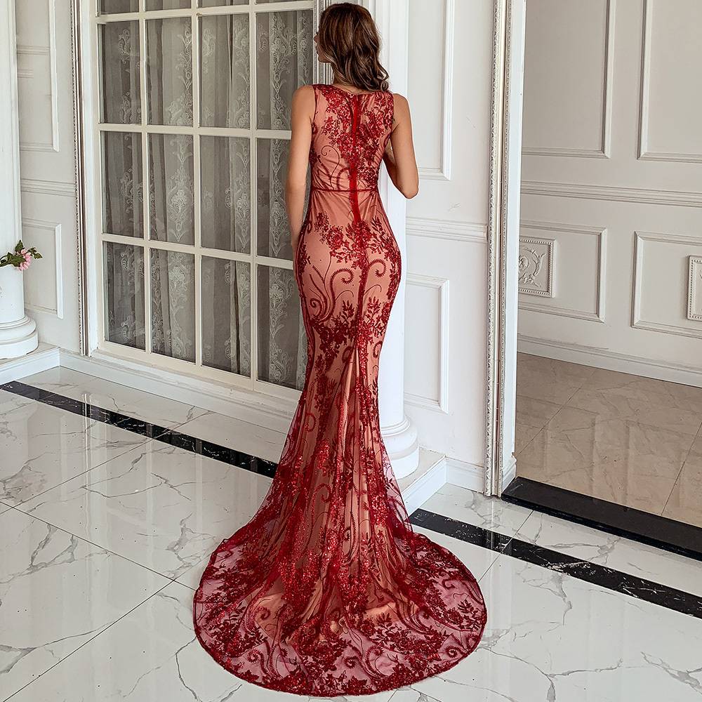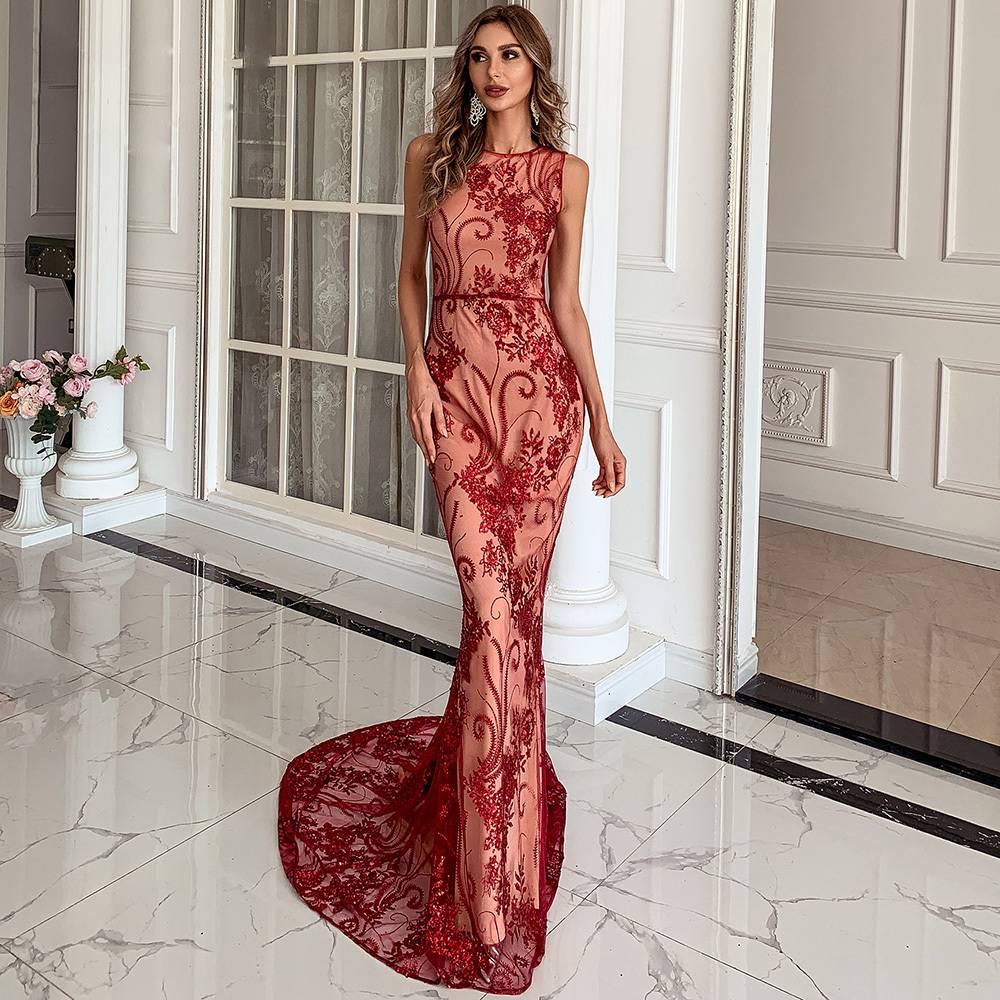 Sleeveless Red Long Dress with Sequin Decoration, Sheath Silhouette, O-Neckline, and Polyester Material