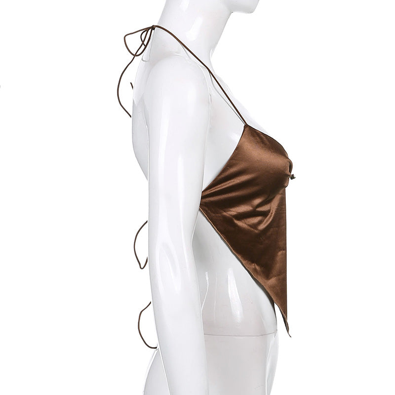 Solid Sleeveless Polyester Spandex Satin Camisole Top with Halter Style