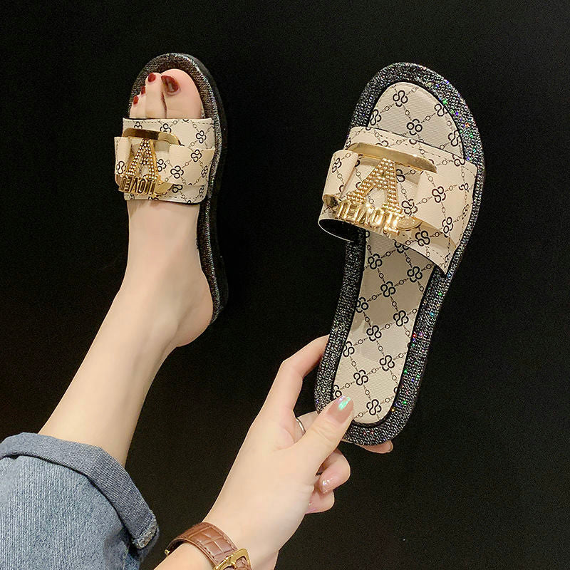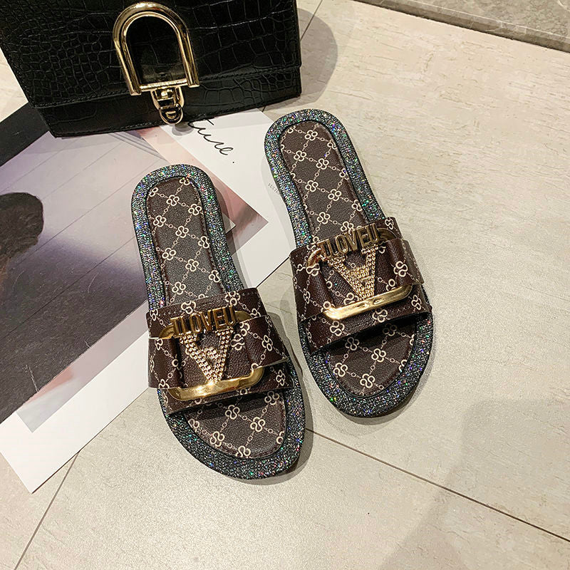 Designed to keep feet comfortable, these casual PU slippers are a practical choice for everyday wear. A metal letter detail provides a stylish finishing touch that is sure to turn heads. A cool geometric pattern keeps this pair of slippers looking contemporary. Wear these casual slippers for a cute summer-style option. Wear them with jeans, shorts, or dresses.