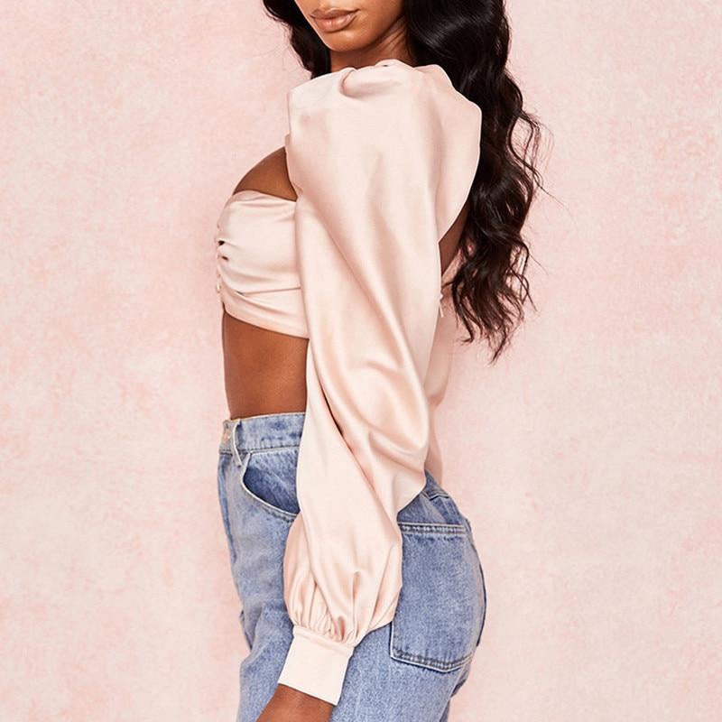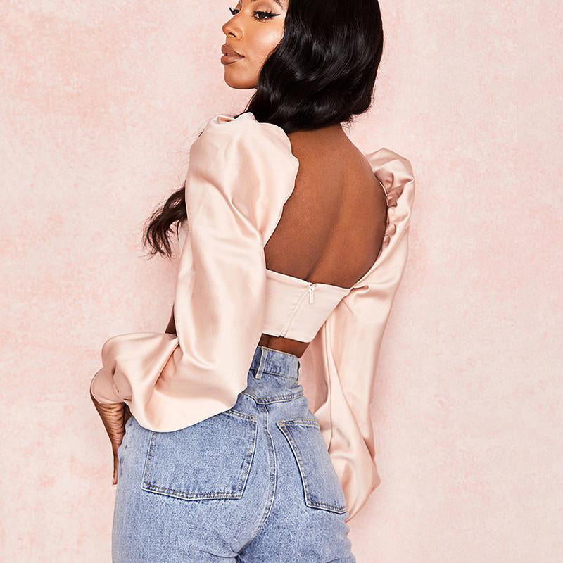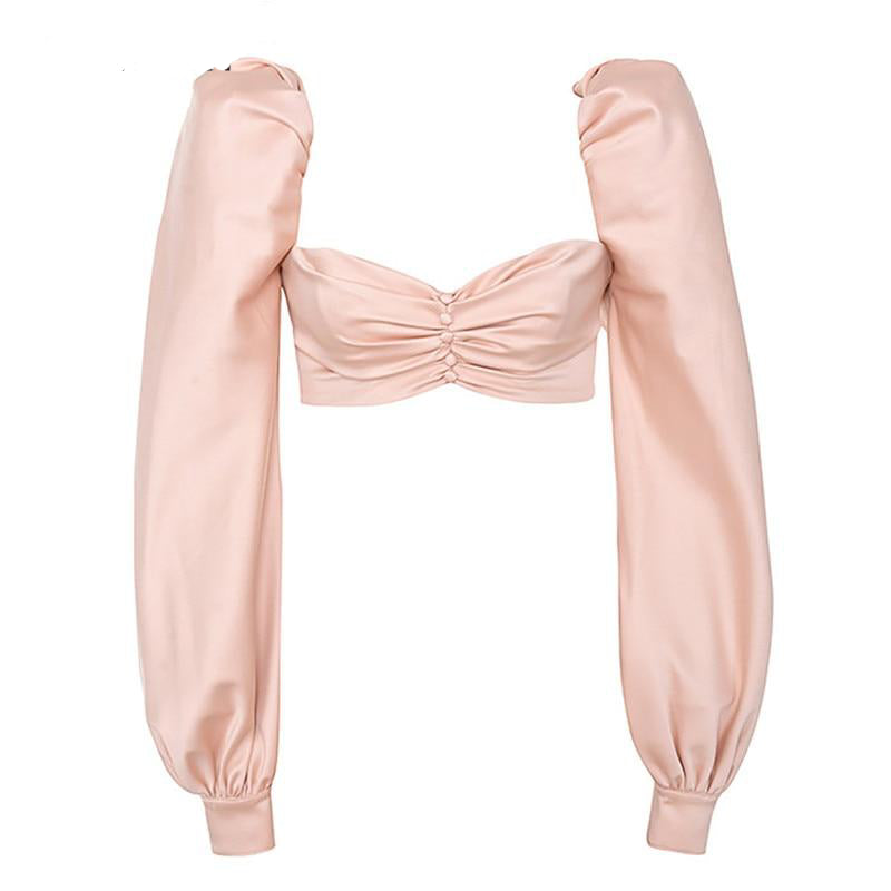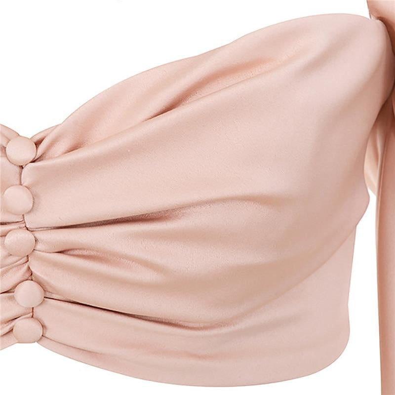 SIlk Pink Backless Pleated Long Sleeve Strapless Crop Top
