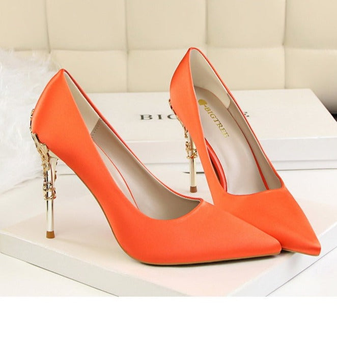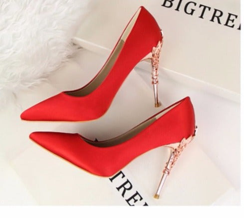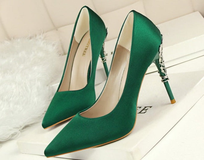 Dress up your favorite outfit with these shoes. The classic pump is a timeless staple in any woman's wardrobe. With a pointed toe and metal decorated heels, these shoes are perfect for a night out.