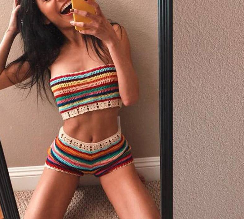 Cotton Polyester Stripe Patterned Strapless Elastic Crochet Bandeau Bikini